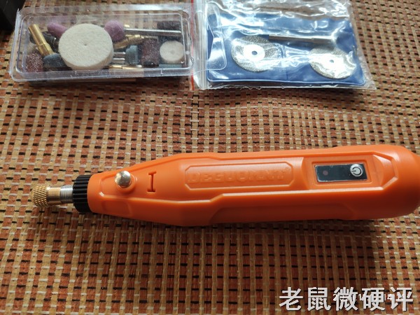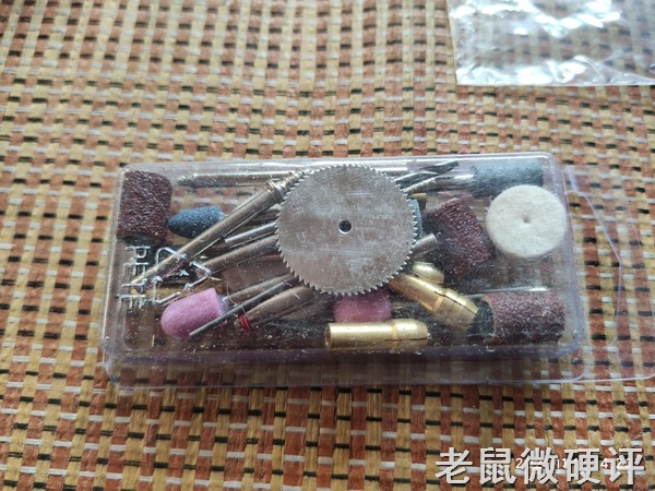 这一套应该就是主机默认配送的工具。里面的夹头还有红色蓝色的砂轮柱以及砂轮纸卷都没问题。但你看表面那个小锯片,那就是一个很薄的铁片,冲压成了锯片的形状,放在那里有个样子,但我都没敢用它,估计切冰棍杆儿都费劲。