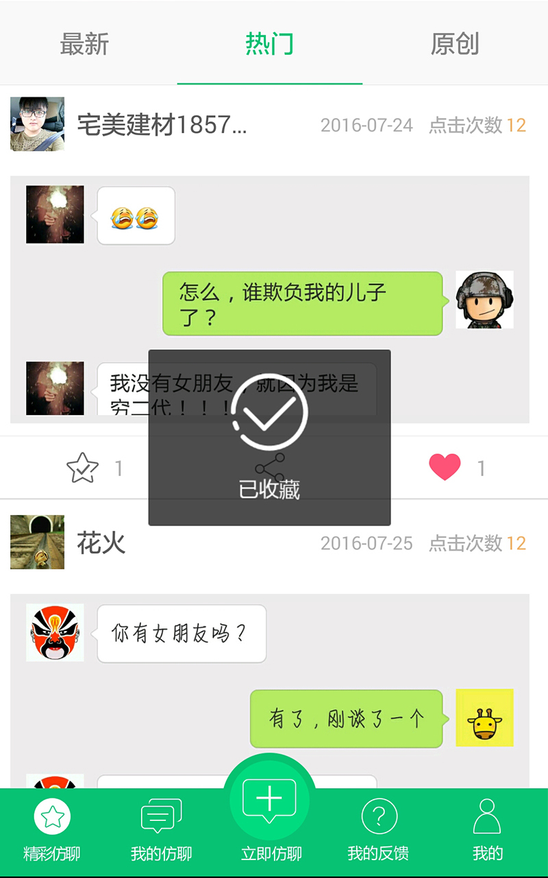 还在惊讶奔波儿灞和灞波儿奔的聊天是怎么制作出来的吗?还在看别人的搞笑聊天截图而苦于自己的段子不能展示吗?机友仿聊这款软件,可模仿聊天截图界面,自主设置聊天对象和头像,同时可将自己制作的段子上传至平台和大家分享。用机友仿聊,人人都是段子手!