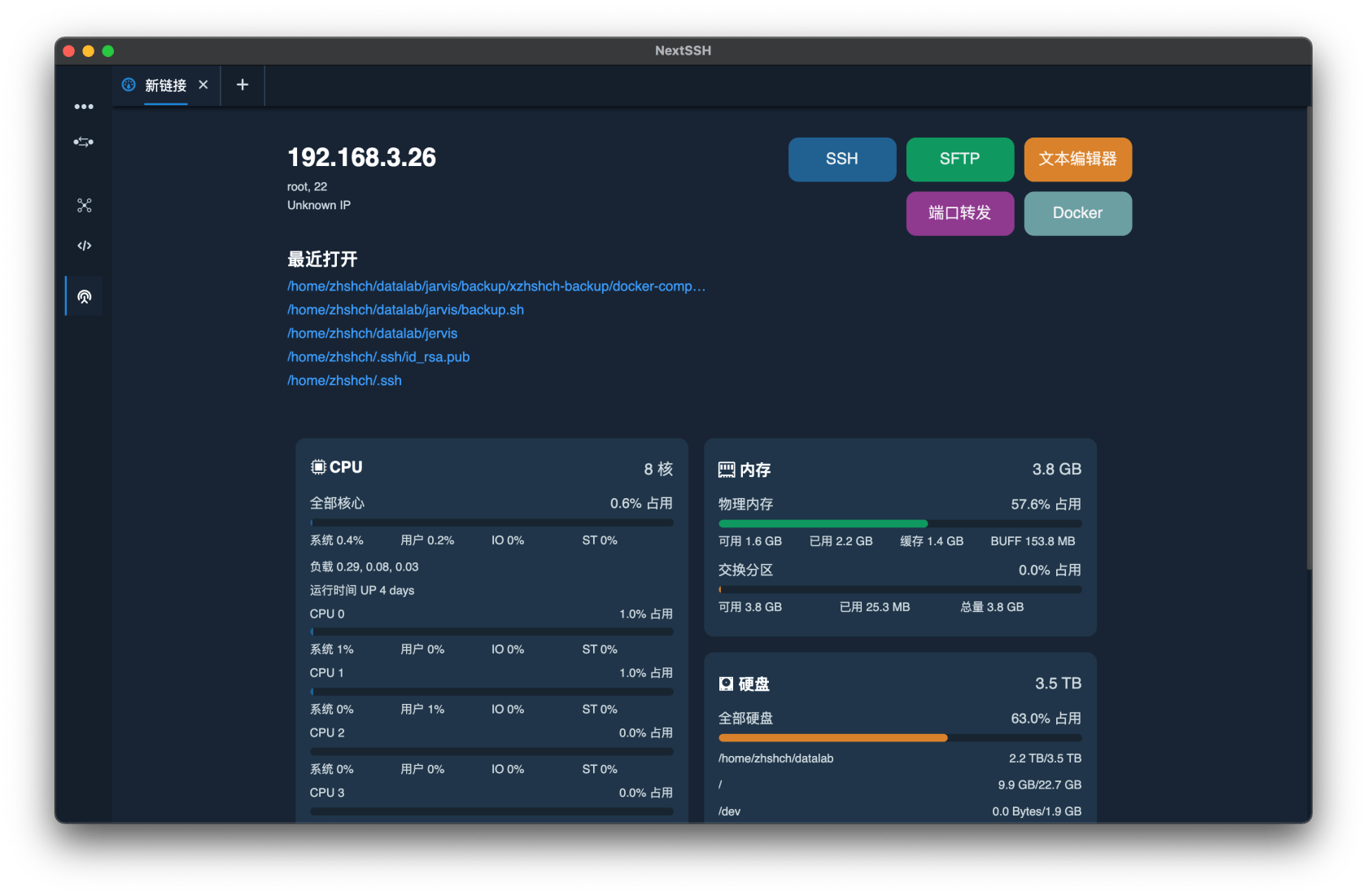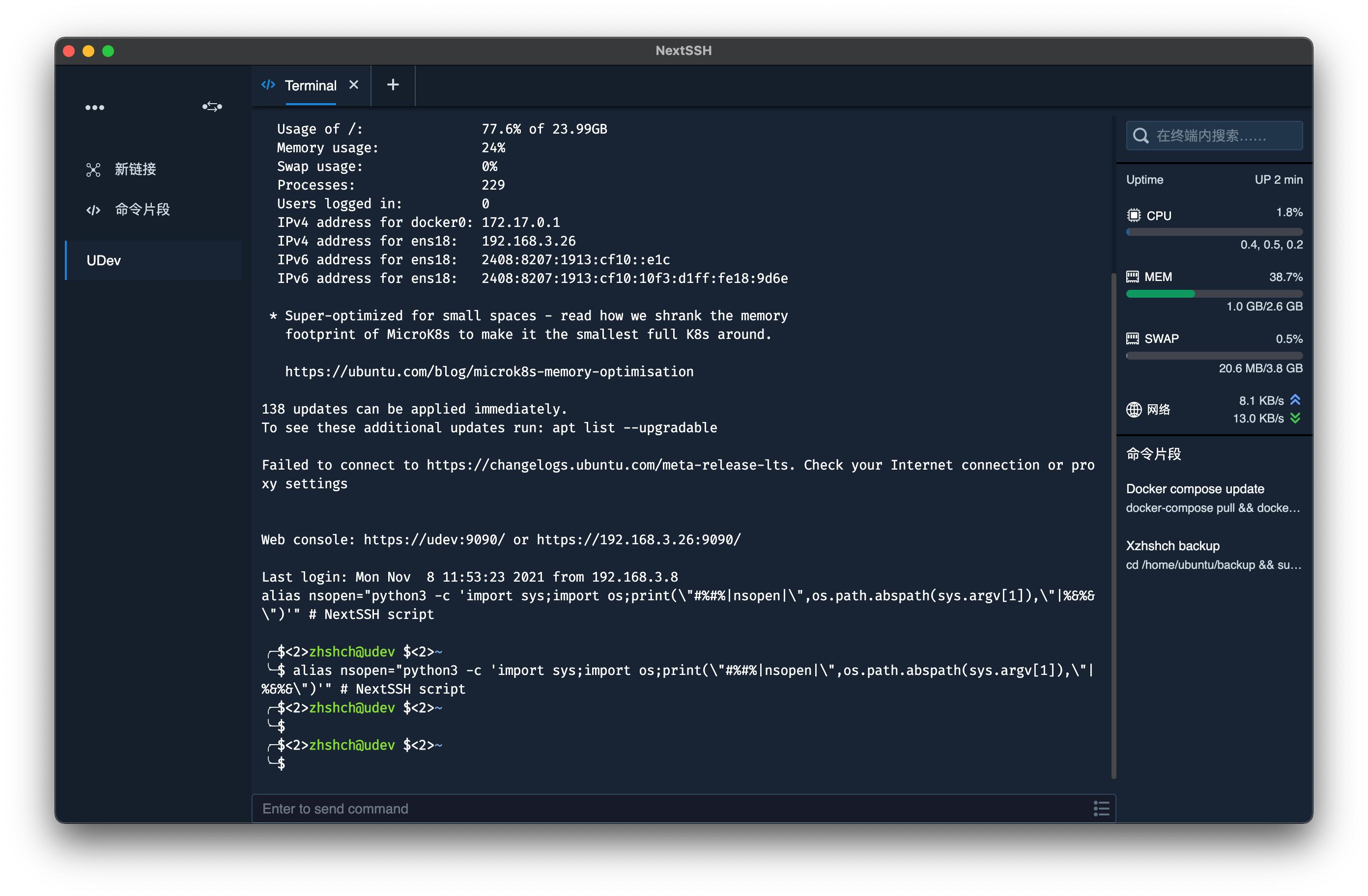 NextSSH 是一个支持 Window 和 macOS 平台的 SSH 连接、管理工具。在终端的基础上增加了一些辅助功能,力图让远程操作变得简洁、直接。