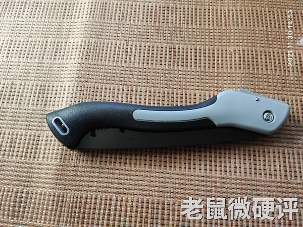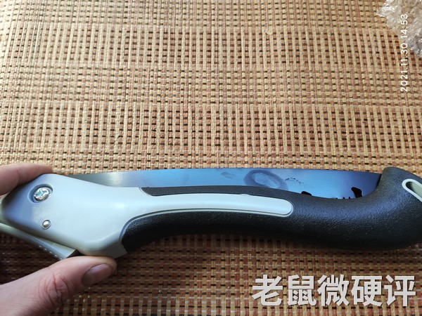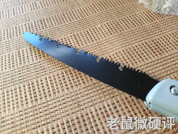 换个角度看一下,锯条上面有特氟龙涂层。那个痕迹是我拿他的时候按在上面的手指印。当然了。这个价格,说图层什么的,也只是现在到手里比较好看而已。