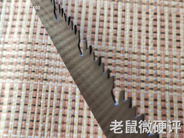 注意,锯齿是向两侧分别倾斜的。一左一右一左一右。这样就出来的豁口会比锯子宽一些,就不容易夹住锯子。不过这把锯子的倾斜幅度不是特别大。而且只有第2到5组倾斜的比较明显。第一组和第六组只是轻微的有一些倾斜。