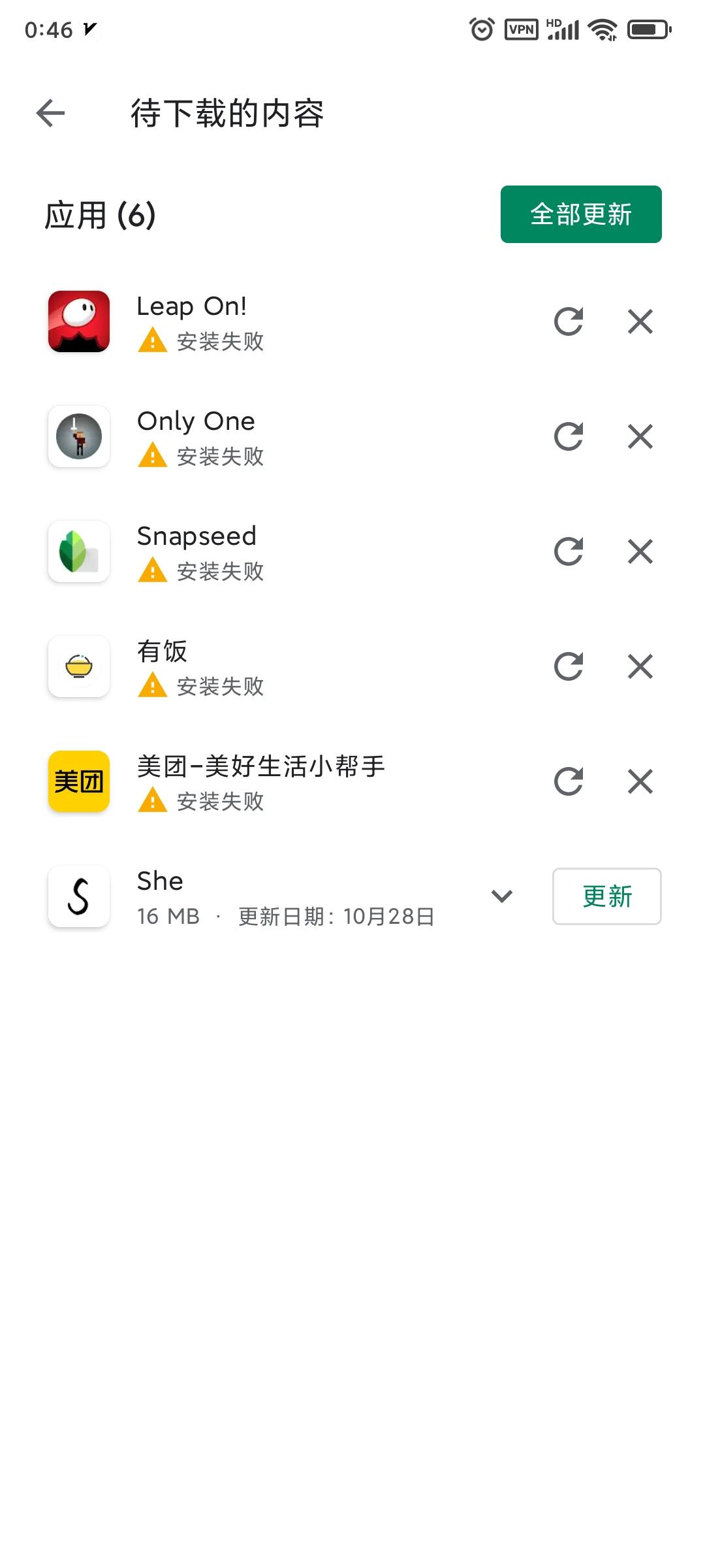 另外,感觉和 app 冻结不一定有关系,因为每次弹出的安装失败的应用都不一样。而且,以我这次的截图来看,那几个游戏 app ,我基本上好几个月没有点开过了,但之前它们并没有被提示过安装失败。美团 app 每一两天都会用一下,要扫自行车,但这次也被提示了。