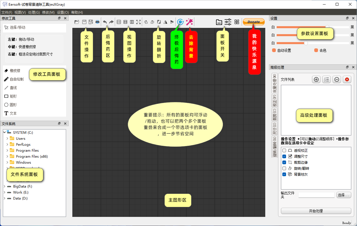 用于祛除手机拍摄的文档、试卷、票据等照片打印出来后的灰色背景,使照片打印出来后美观且节省打印耗材,支持简单后期处理(橡皮擦擦除不需要的部分,和简单标注)