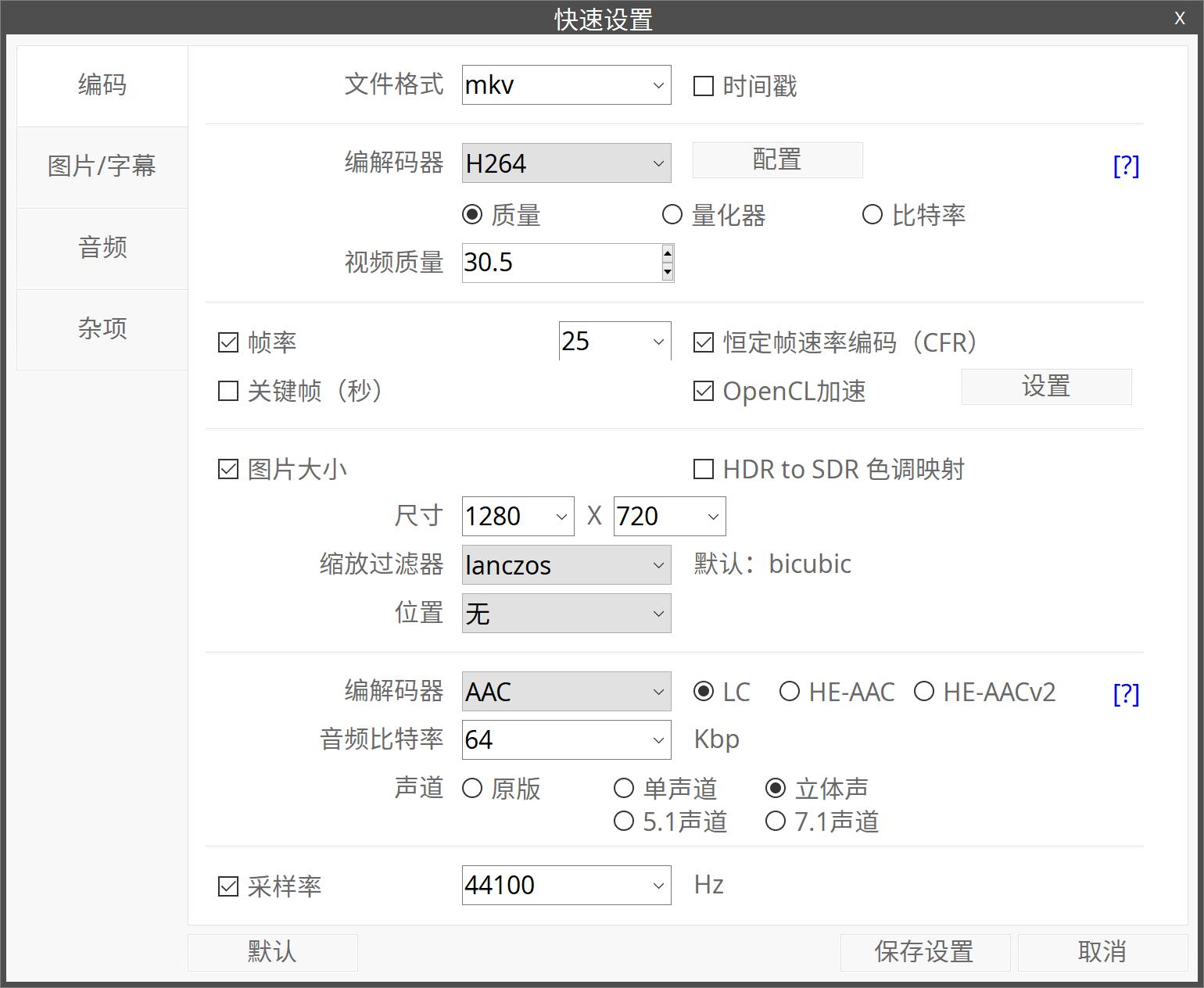 音频:如果原视频的音频比特率较低(低于320)我会考虑直接复制,因为转码总是有损失的。如果原音频高于320Kbps我会转成AAC,比特率320,声道用立体声,采样率不变。