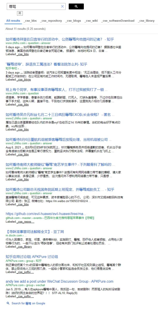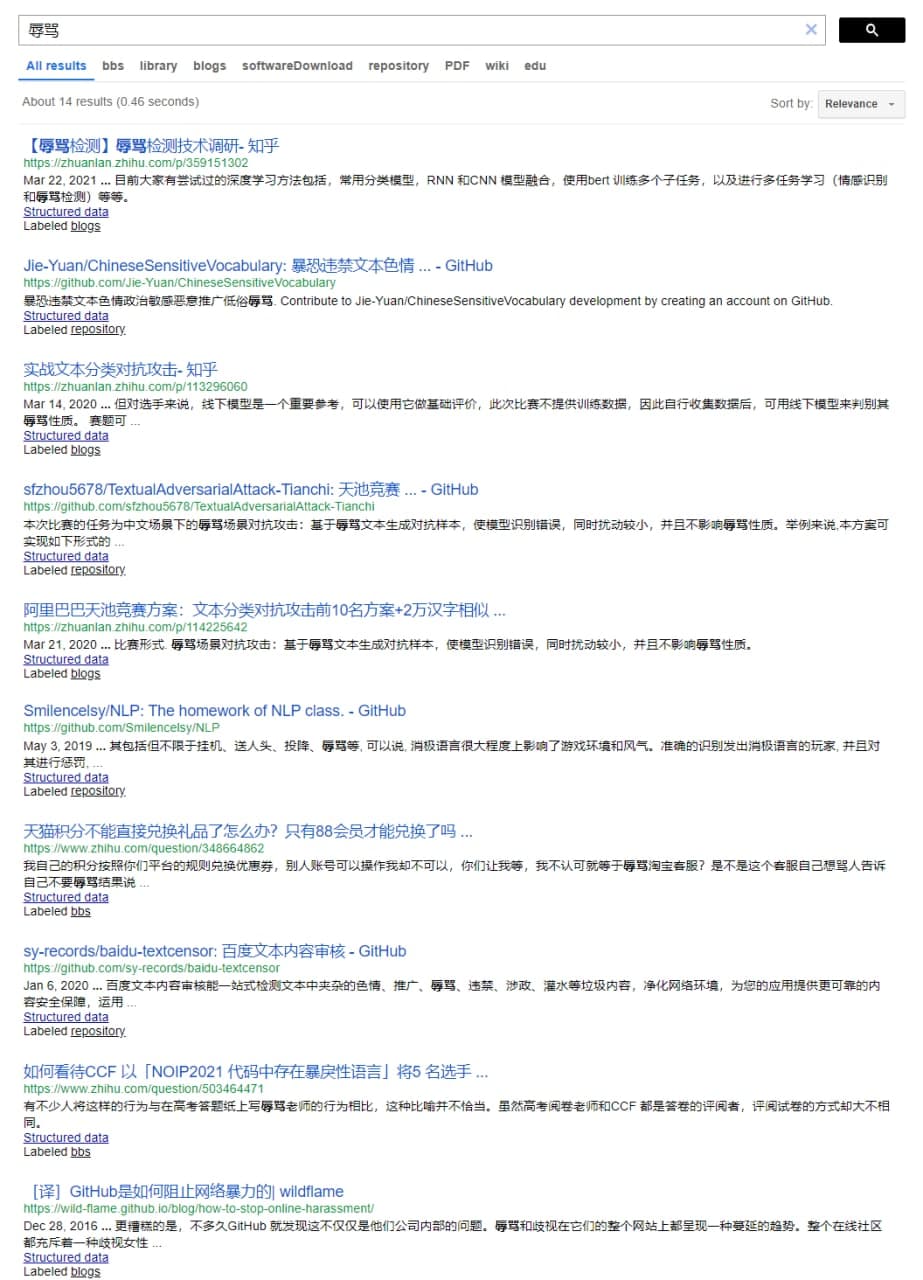 假如添加了以上5个“实体”,那当我搜索“辱骂”这个词时给出的结果将会是: