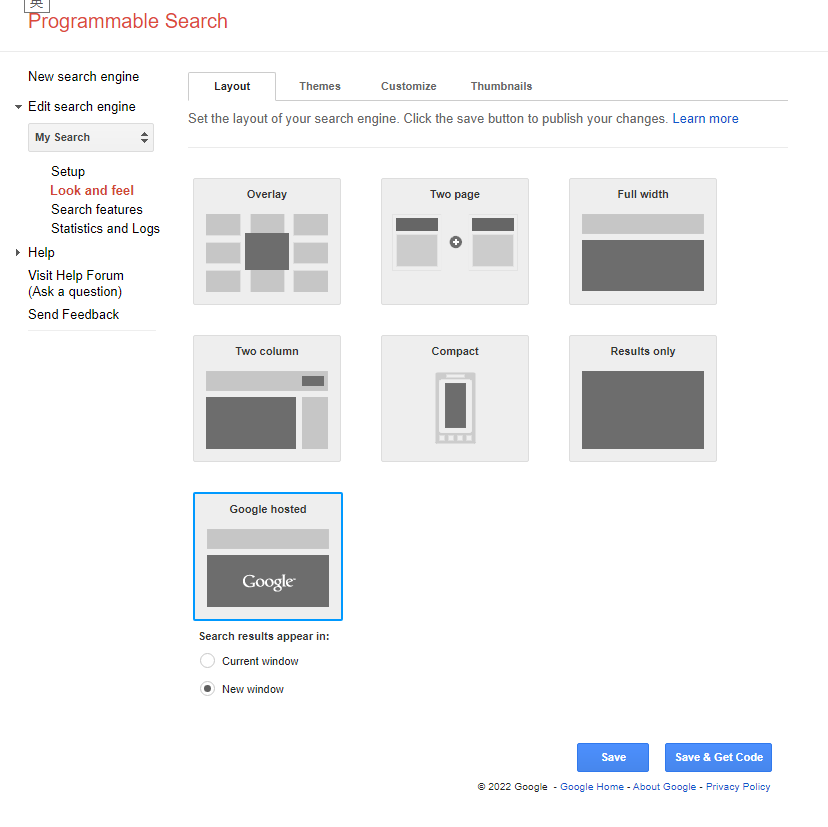 CSE control panel > Search Features > Advanced > Web Search settings > Link Target section: