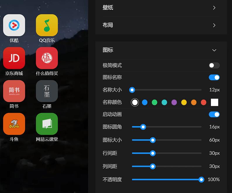多个搜索引擎可以快速切换,搜索框大小和颜色可以自己调,图标大小和样式可以调,图标可以自由拖动,可以无限切换壁纸和设置毛玻璃效果,可以将图标按照功能或使用场景分组,界面布局样式也可以自己设置。高度自定义不是一句空话,你想要的都可以有。