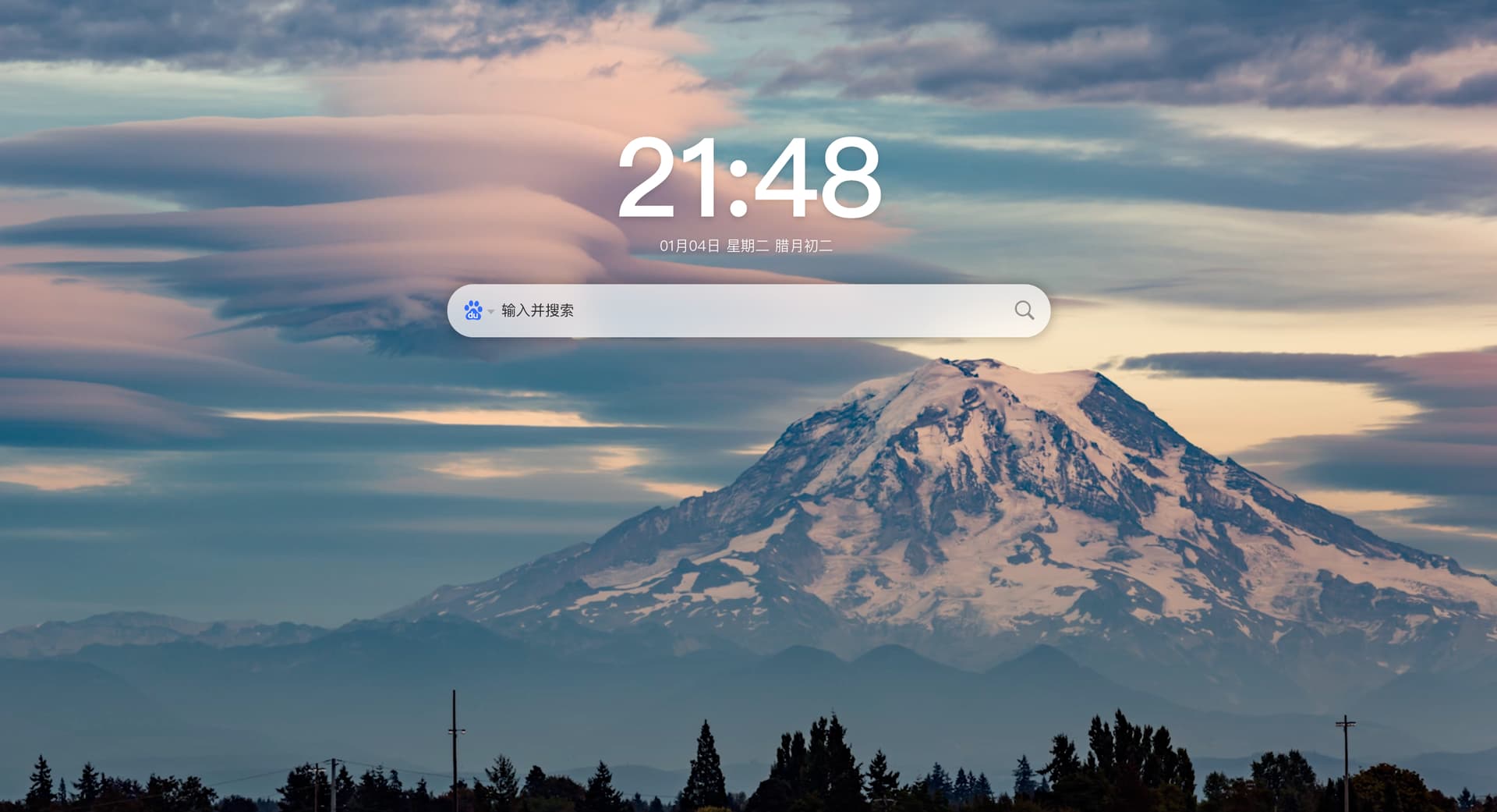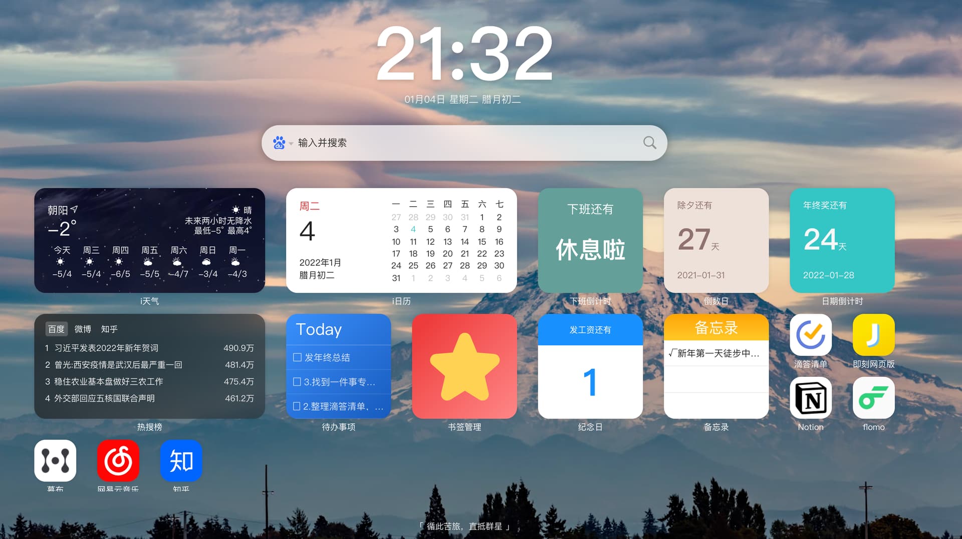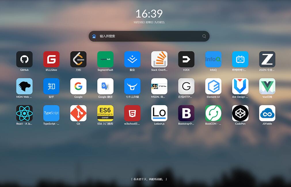 点击时间,就会进入极简模式,只有一张你喜欢的壁纸和一个搜索框,没有任何多余的信息干扰。你将完全沉浸在你的工作,或者你的虚拟世界里。