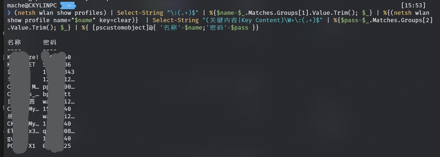 (netsh wlan show profiles) | Select-String "\:(.+)$" | %{$name=$_.Matches.Groups[1].Value.Trim(); $_} | %{(netsh wlan show profile name="$name" key=clear)} | Select-String "(关键内容|Key Content)\W+\:(.+)$" | %{$pass=$_.Matches.Groups[2].Value.Trim(); $_} | %{ [pscustomobject]@{ '名称'=$name;'密码'=$pass }}