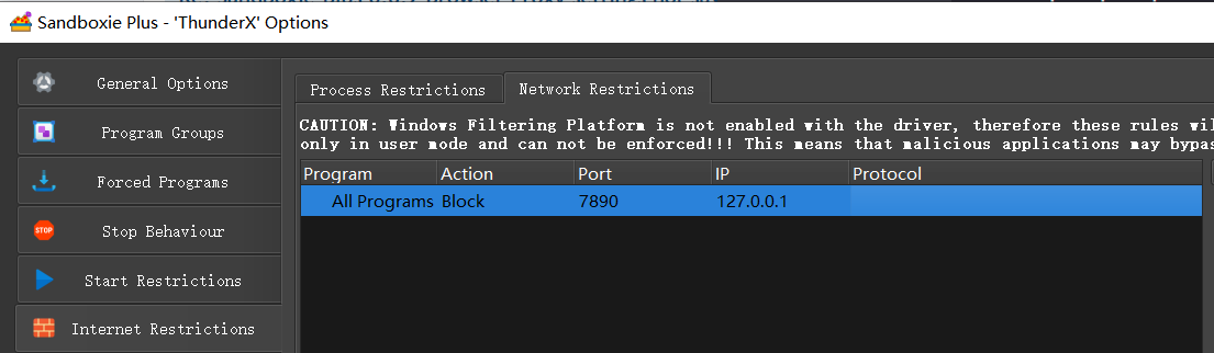 启用WFP后这起不到作用,因为WFP不拦截本地环回连接。但设备禁用级别的话可能有用,但是根据提示,只有应用层能拦截。