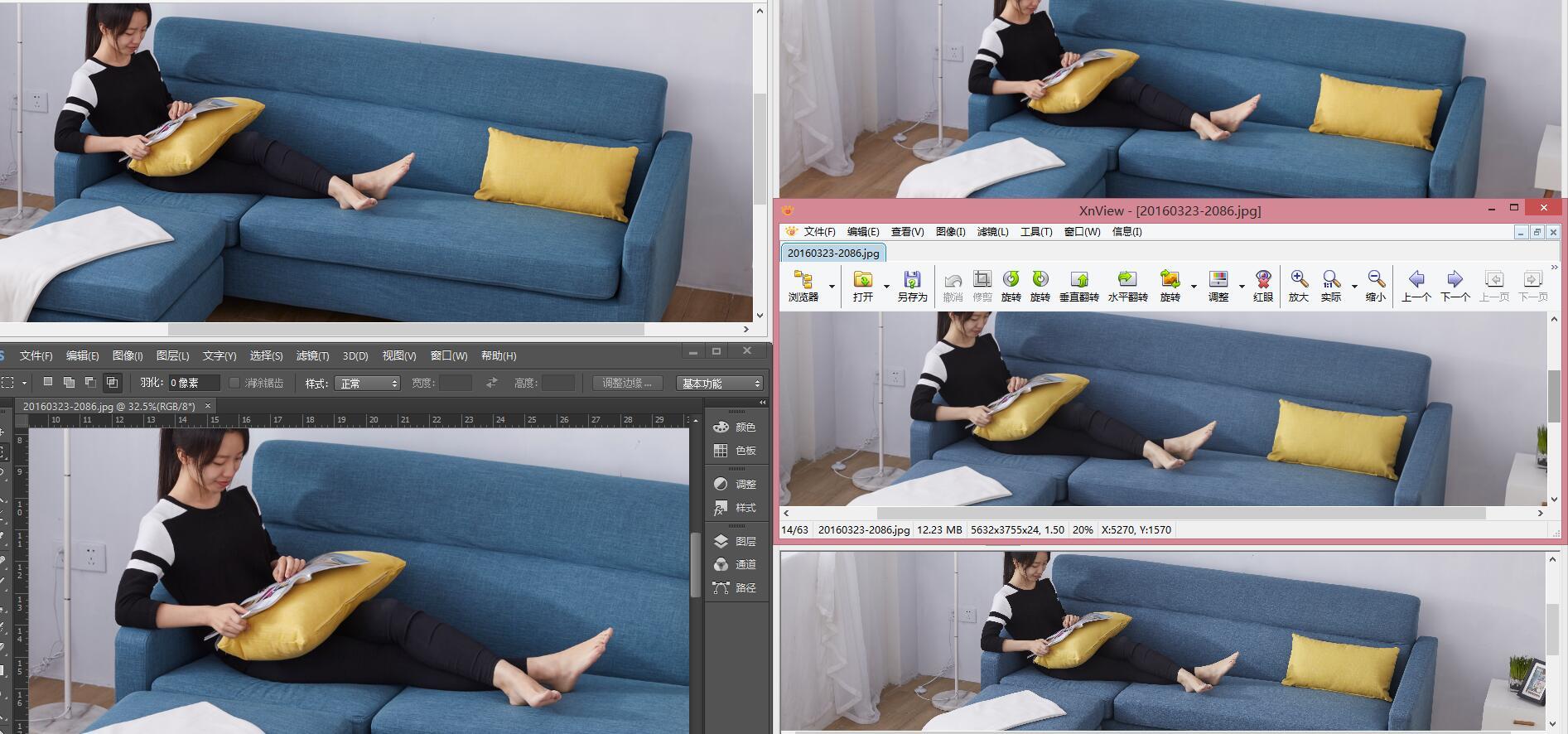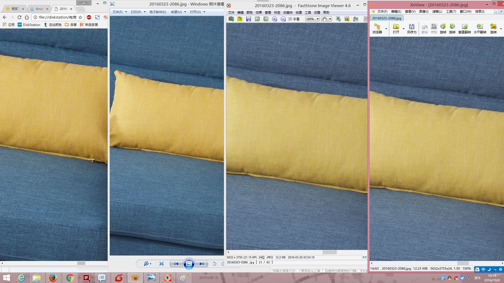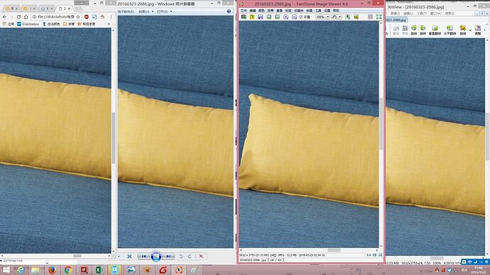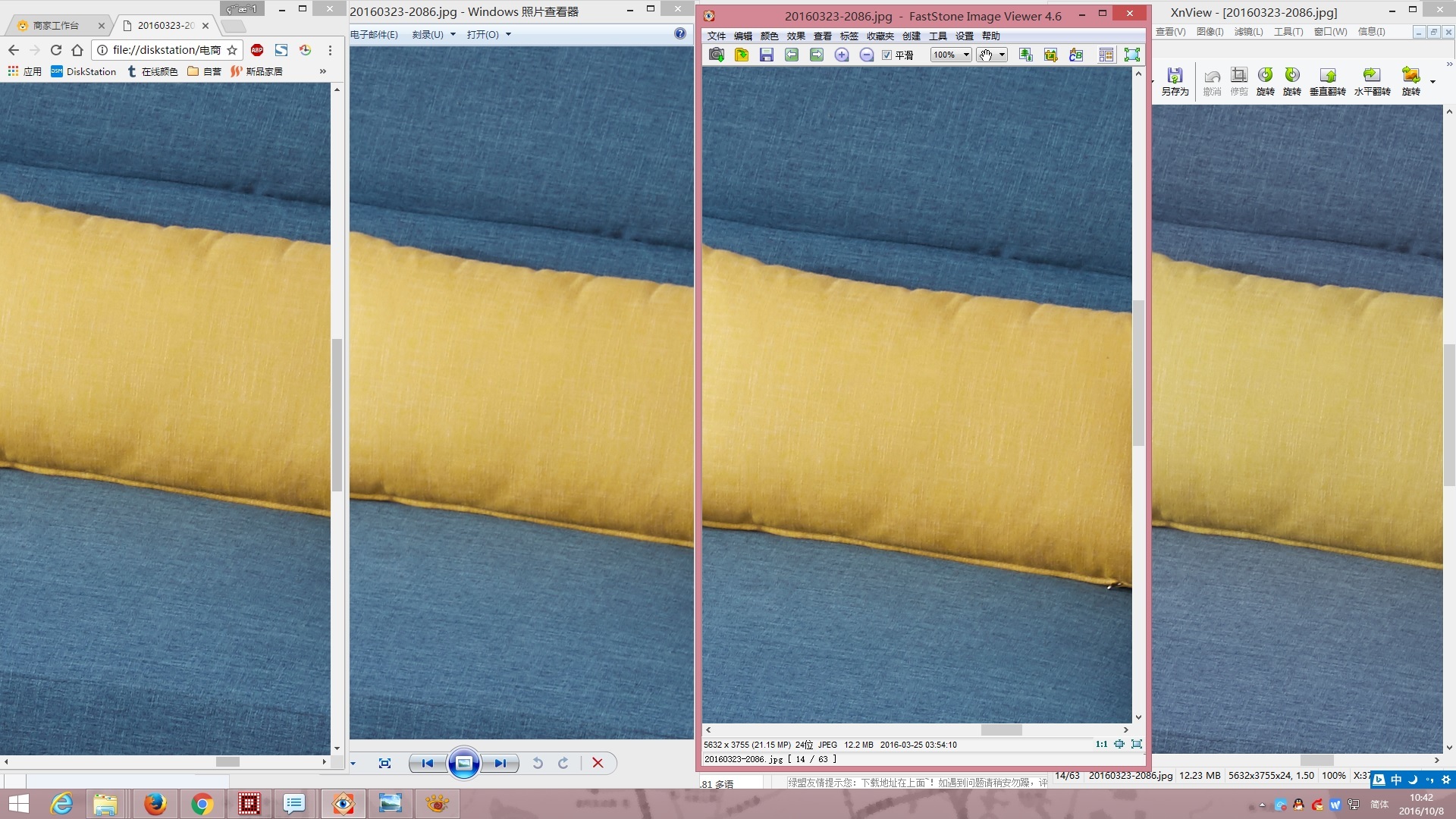 可以看看这张图,都是100%的局部比较,分别是chrome、windows照片查看器、楼上推荐的FSviewer和Xnview。还是能看得出,显示出来的蓝色沙发的色差比较大的~后面2个软件出来的效果,简直惨不忍睹…