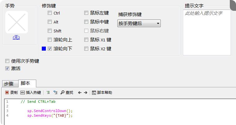 只有按住Ctrl不松,再连续按tab键才是连续向下切换标签,我就想实现按住右键后保持Ctrl按住不松的状态,松开右键后就释放Ctrl键的功能