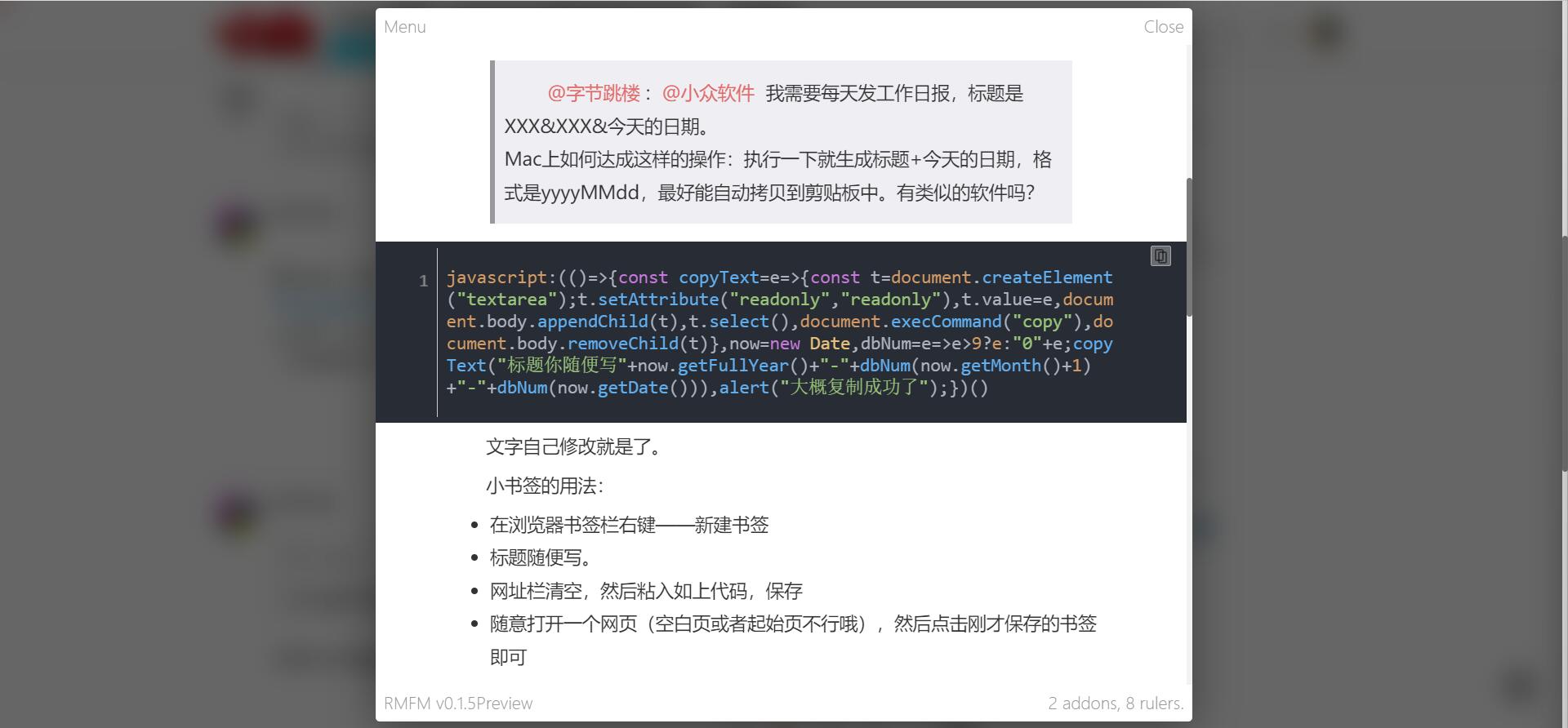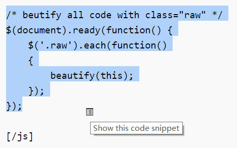 当鼠标经过 pre 或 code 标签时,左上方会出现一个小图标,点击即可弹出小窗。