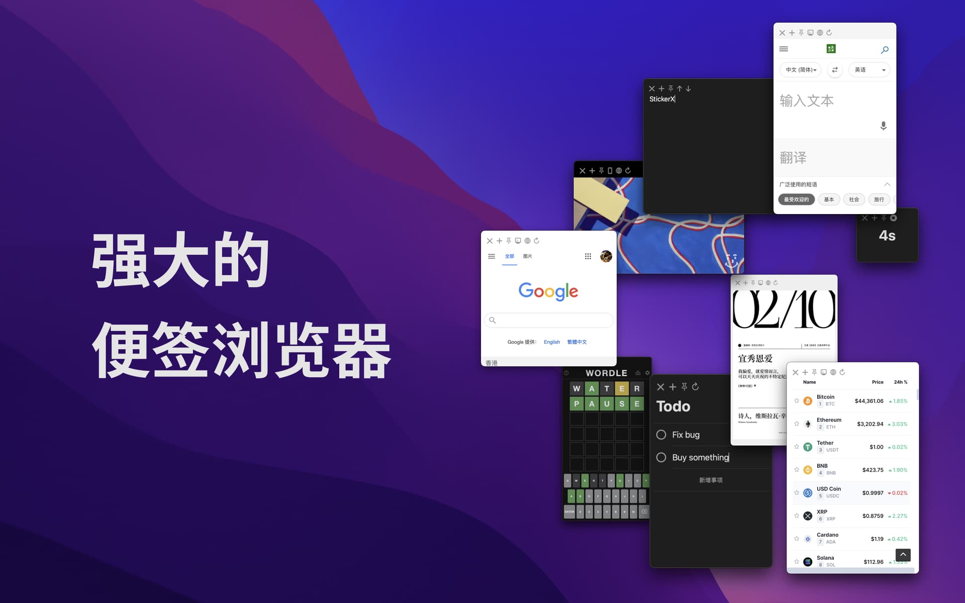 StickerX 有五种便签形式——网页便签,文字便签,代办便签,时钟便签和计时器便签。它们能优雅有效的处理所有有关的事务,您可以快速记录文字,打开直播的音乐频道进行聆听或者实时监控市场价格。