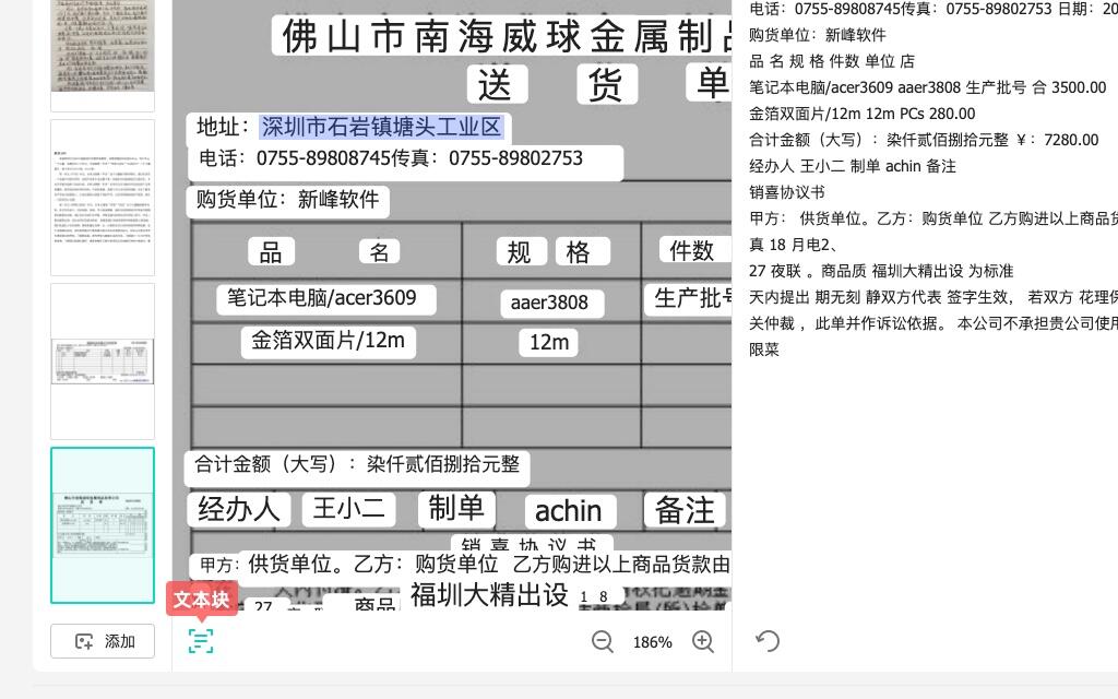 比如有一张送货单,如果你只想复制上面的地址,在全部文本中找稍稍有点困难。不如开启图片的「文本块」显示模式,即可直接在图片上,用鼠标拖动选择需要的文字,「Ctrl+C」就可以复制了。