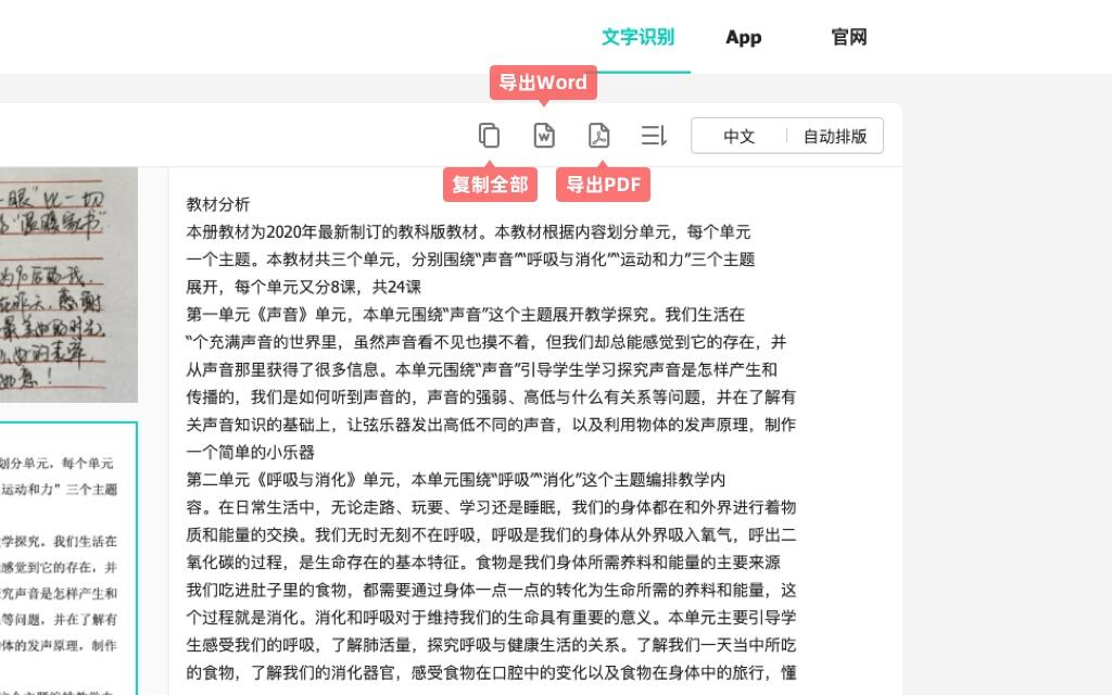 识别结果可以复制文本,或导出生成Word文档。上传的图片还可以一并生成一份PDF文档。三种导出方式,应有尽有。