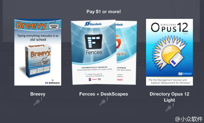 Humble Bundle 不错,价格自定,只要 1 美金以上就可以获得 Fences + DeskScapes、Directory Opus 12 Light、Breevy 几款软件。