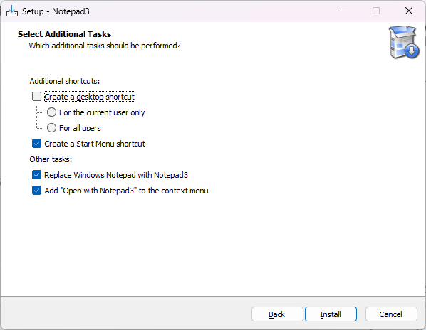刚刚从官方网站下载了5.21.1129.1版本的notepad3,在软件安装的时候就有选项“将系统记事本替换为Notepad3”。我电脑的系统是Windows 11,我没有尝试这个选项是不是起作用。