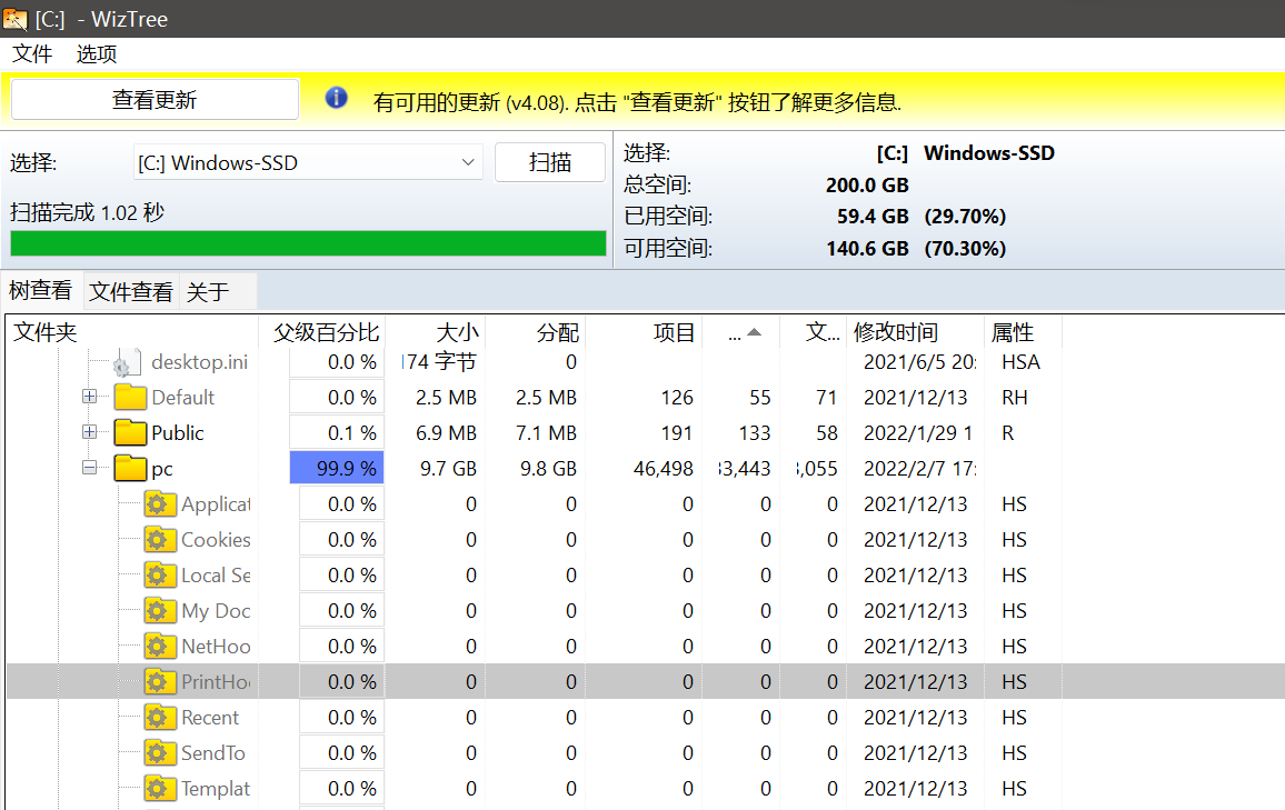 - WizTree有便携版,有中文,界面土一点点,但是不能按照文件数量计算百分比、绘制图表,可以导出CSV文件。