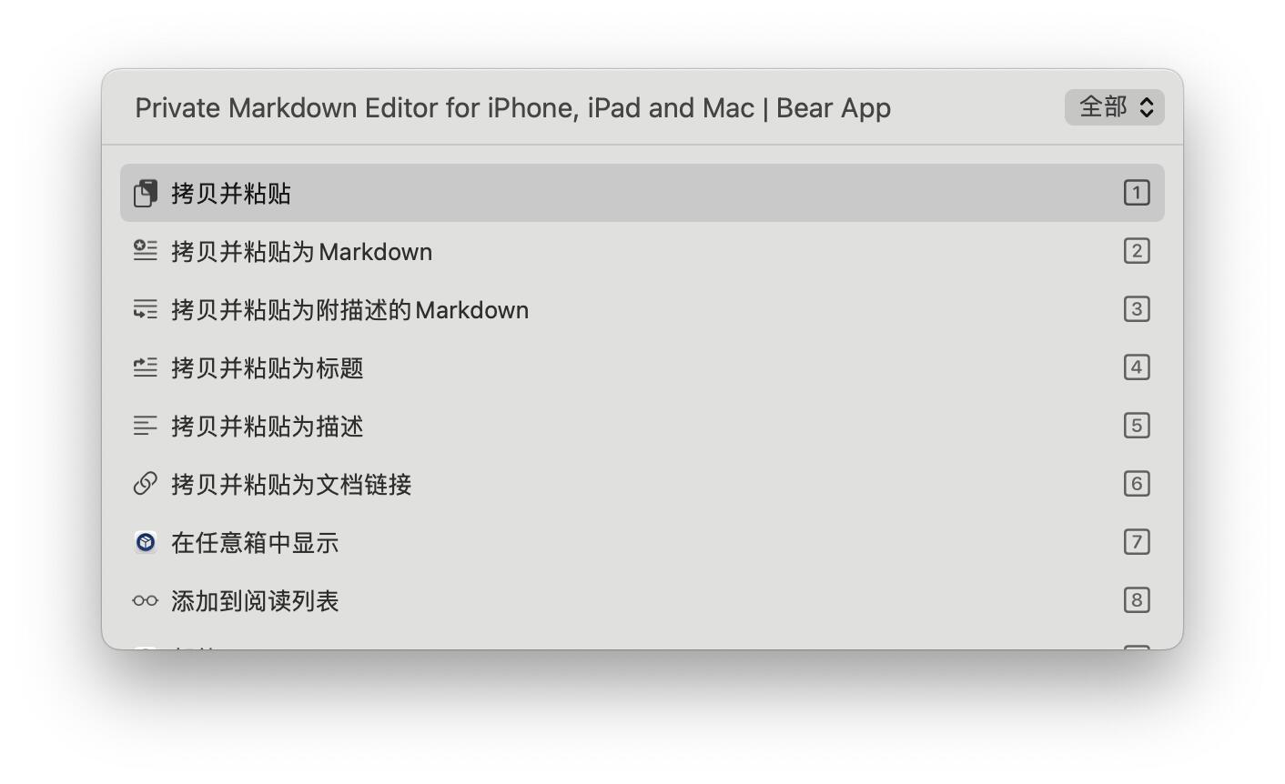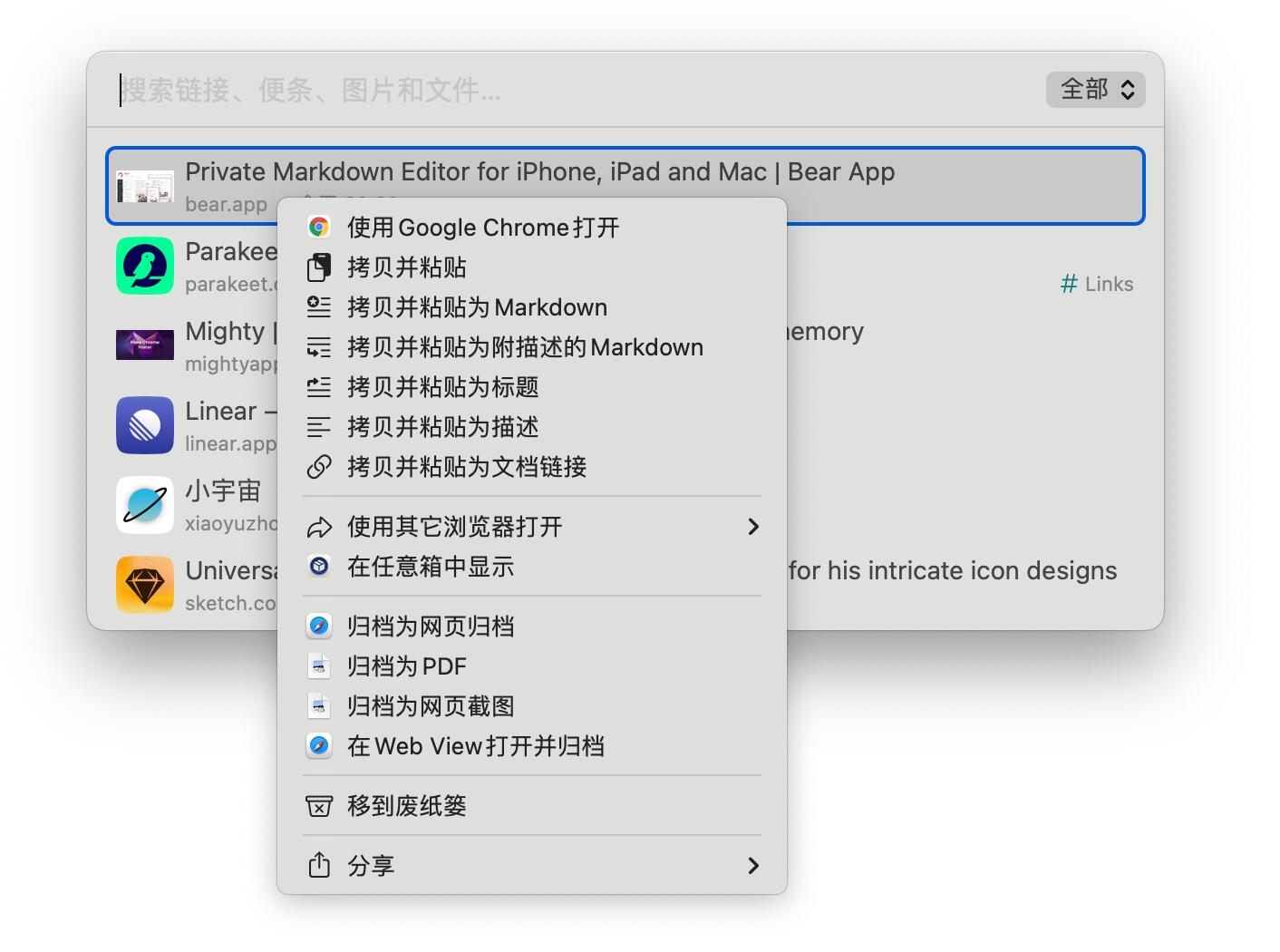 使用全局快捷键激活类似 Spotlight 的窗口,然后搜索并打开想要的链接,还可直接以 Markdown 格式粘贴链接。