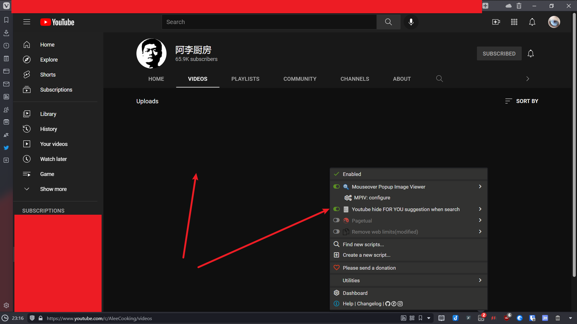 视频博主的主页内容也清空掉,正常体验无法保障。禁用扩展后才恢复视频博主主页的视频列表