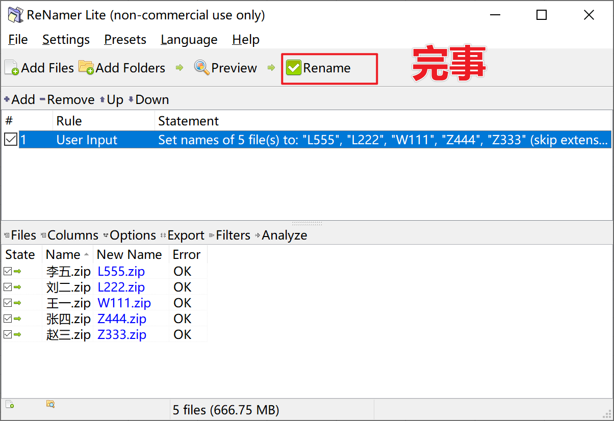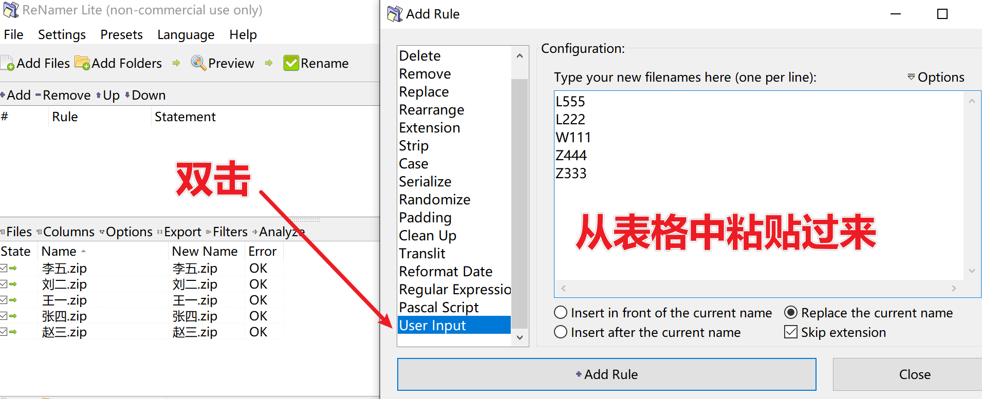 我用的是ReNamer,请教下,现在有一百多人 对应类似这种 L411612061238490666 字母和数字混合的标识码,然后怎么样把一百多人名字命名的图片替换成名字对应的标识码 我试了不成功.或者有其它办法吗