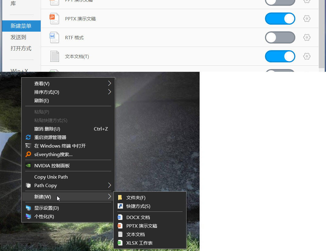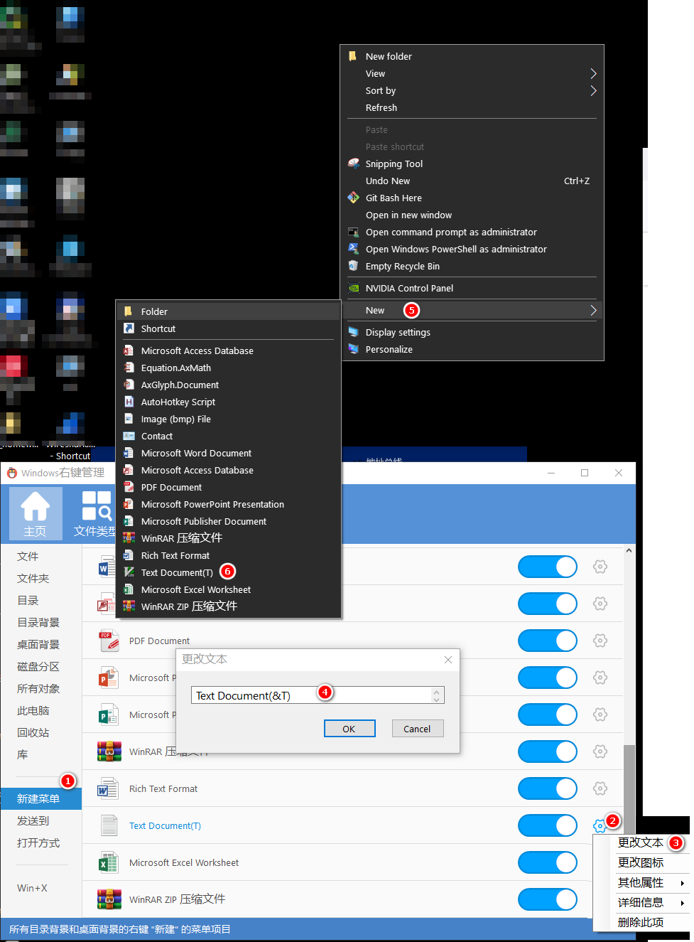 ⑤ New 的 (&W) 是自已就有的,不知道是什么时候的,可以是因为排序问题 New 中的 w 是第 3 个字符,在我的右键菜单中,除第一个 New Folder 外只有这个排第 1. (7-zip 并没有设置按键,但是按 7 时会定位到 7-zip 所以,这确实跟字符排序有关)