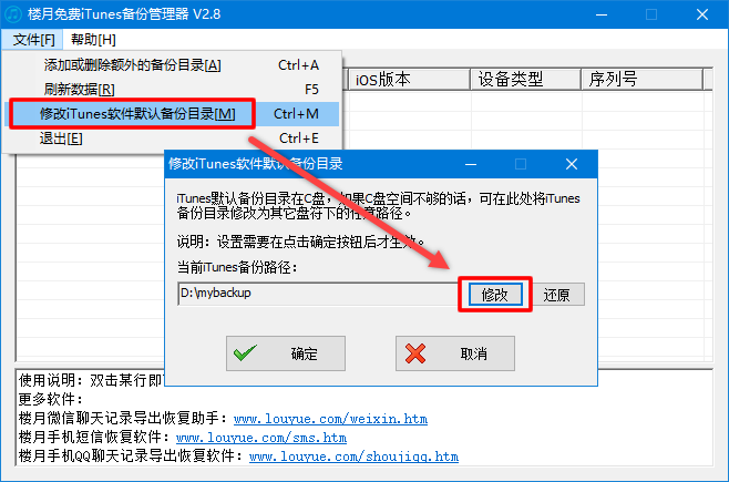 但使用楼月免费iTunes备份管理器的话,只需要一步,点击“文件”,“修改iTunes软件默认备份目录“菜单,然后在弹出窗口中直接修改即可。