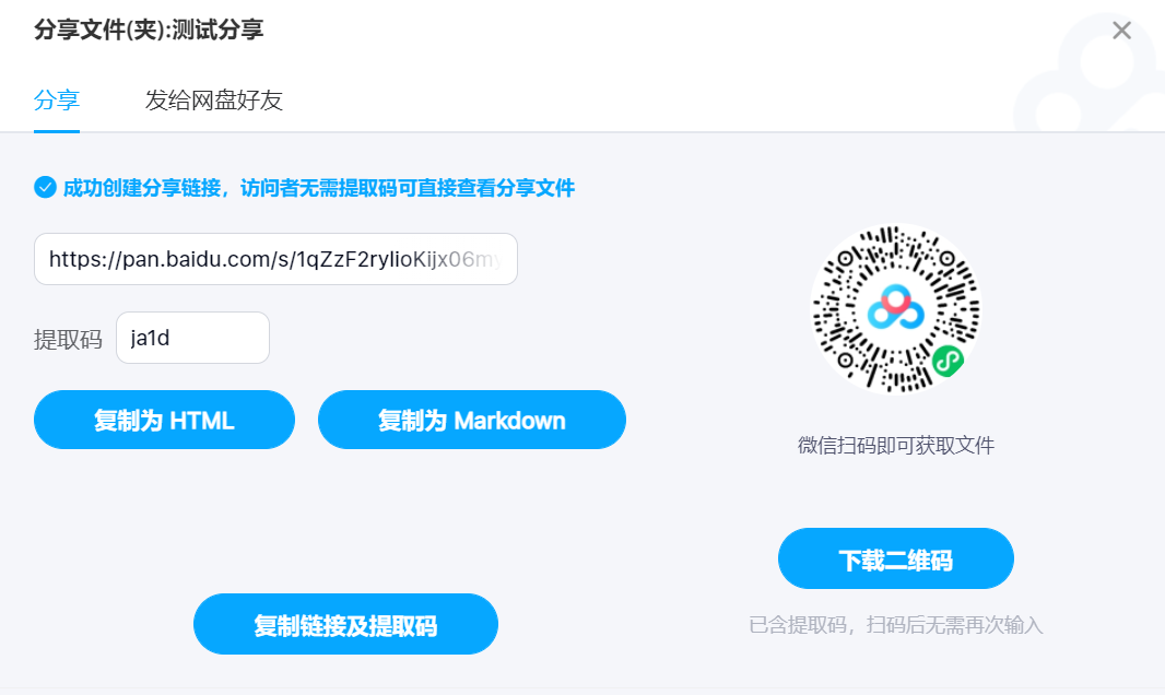 使用度盘创建分享时增加两个按钮,用于将分享链接复制为 HTML 或 MarkDown;