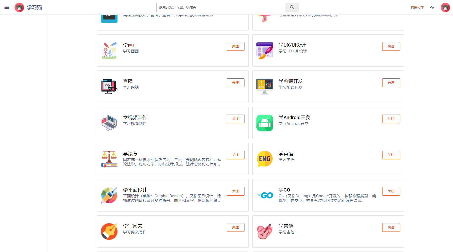 「学习猫」提倡分享,如果你在学习某个技能时找到了好的资源,欢迎你分享到「学习猫」,给其他新手提供些帮助。