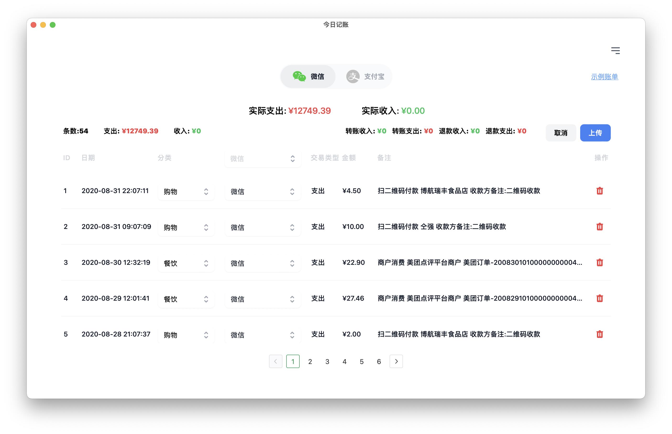 - 你只需拖拽账单到APP中,它会自动识别账户/转账/退款,它会自动的对账单的内容进行分类,比如滴滴打车它会分类为交通,它是多端数据同步的(iOS/Android/Mac/Windows),因此当你上传读取后的数据后,可以在手机端查看记录和统计,比如你可以查看交通花了多少钱,餐饮花了多少钱等等,如果想了解手机版本也可看我们之前的文章或者访问今日记账的官网。