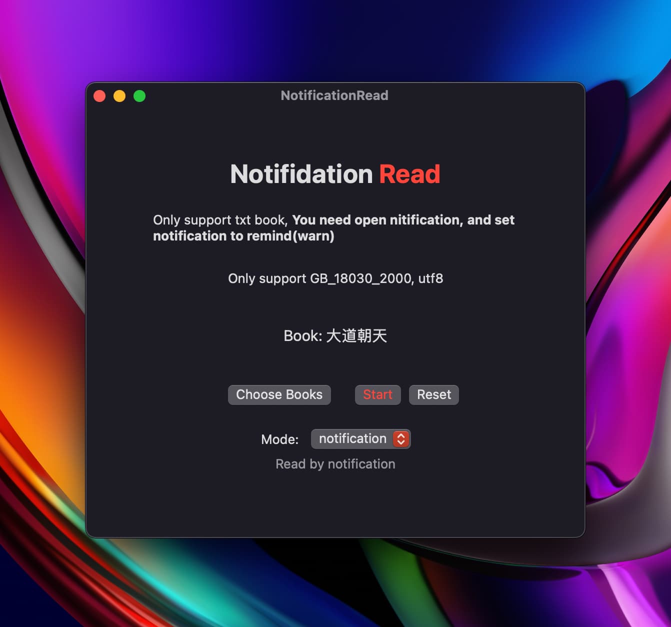 正如其名,NotificationRead是通过通知来摸鱼的。NotificationRead会每次发送给你小说中一部分内容,并通过通知按钮来控制——往下、往上、重设