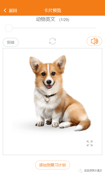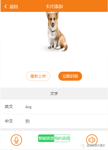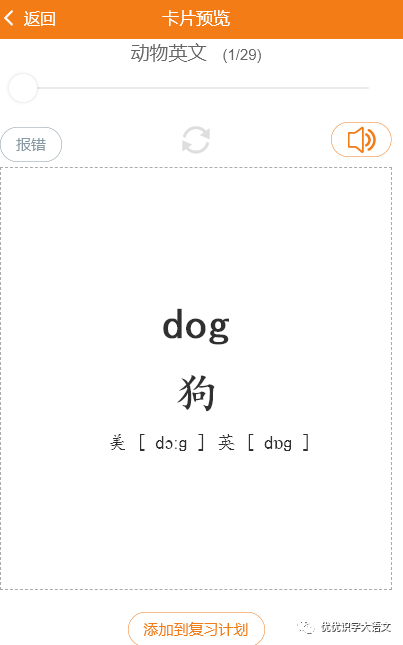点击保存,卡片就创建好了,优优卡片会自动关联卡片的多种英语单词发音,声音效果(这里是狗的叫声)等。