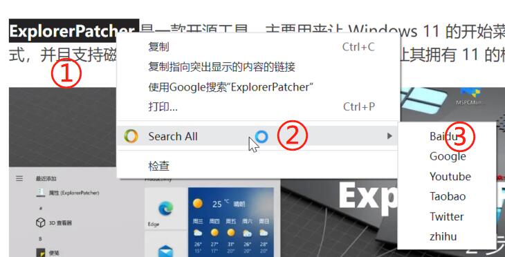 但这样操作起来需要3步,不够效率,同时Search All会显示在右键菜单的最下方,需要大幅度挪动鼠标(图片上是chrome截取的右键菜单,比较少,而我常用的edge浏览器右键菜单有20多项,所以就很麻烦)