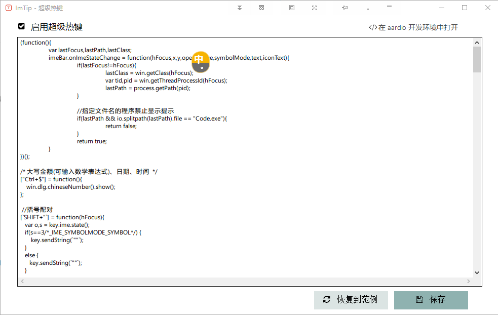 另外ImTip虽然只是一个输入法提示软件,但我的需求ImTip除了全局排除没有外,基本都满足了。所以就利用超级热键(实际上我也只利用来添加了""和()的补全以及数字大小写一共3个功能)小修小补一下即可,不再额外多开一堆软件