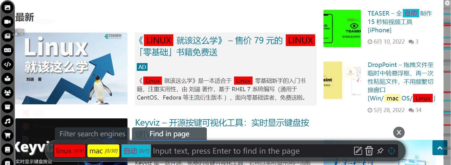 写了个页内搜索。支持多词搜索与分组定位、正则匹配,自定义提示与样式,自定义分隔符,所有标签页全局高亮,定位导航侧边栏等。