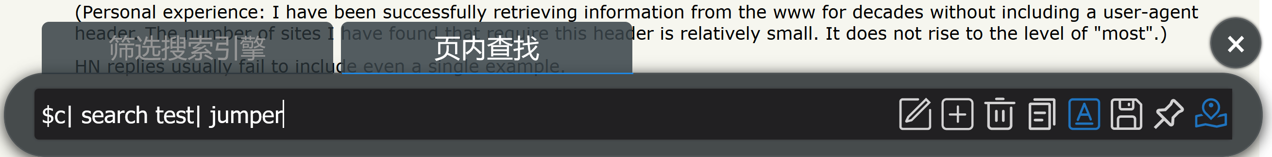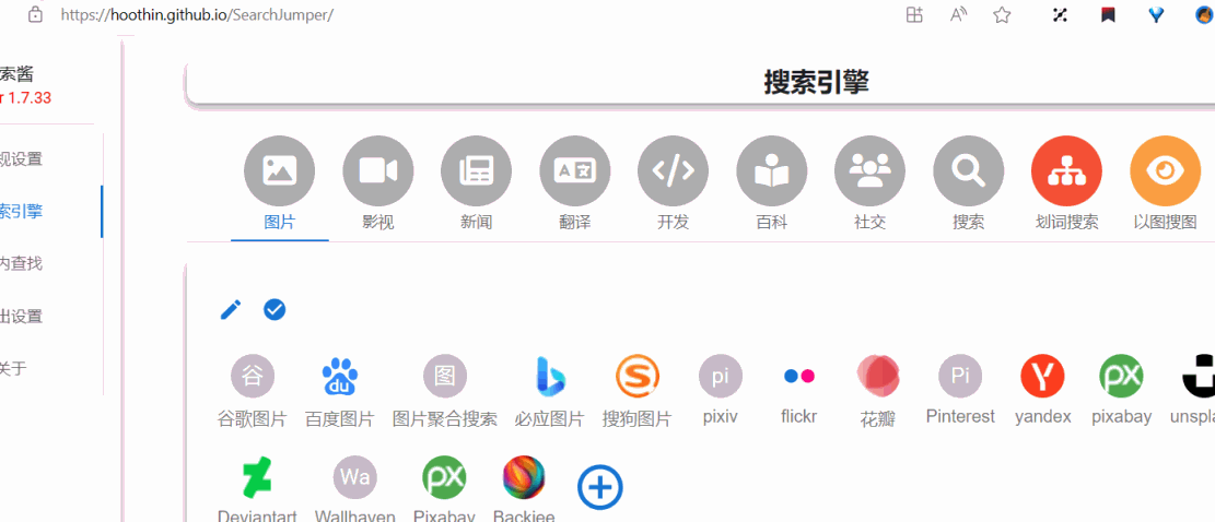 weibo,分组内容 /123456/li (l 代表筛选链接,i 代表不区分大小写,123456 即为你要屏蔽的用户 ID)@weibo,隐藏父级元素,根据层级调整父级深度,保存高亮规则。链接处理分组 新增引擎,内容为 find.addto(weibo):%t.replace(/.*u\//,""),代表将指定链接中u/后面的 ID 提取出来添加进 weibo 分组。添加根据 url 正则匹配:u/\d+,代表仅在链接包含u/xxxxx的用户名链接上唤出时该引擎才出现。屏蔽,用户就被屏蔽啦。新增了all页面的指定引擎调用,例如https://hoothin.github.io/SearchJumper/all.html?kw=搜索酱&engine=百度。便于通过外部全局划词软件(例如 utools / popclip)调用搜索酱当中的某个引擎搜索
