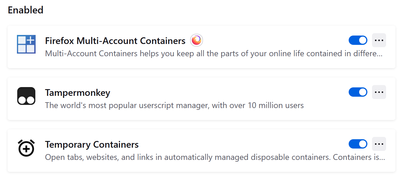 我也怀疑是和某个扩展冲突了,但当我只保留这3个扩展的时候,问题仍然存在。我没有继续禁用另外两个扩展,因为我的 Tab 很多,担心会有不可预料的后果。