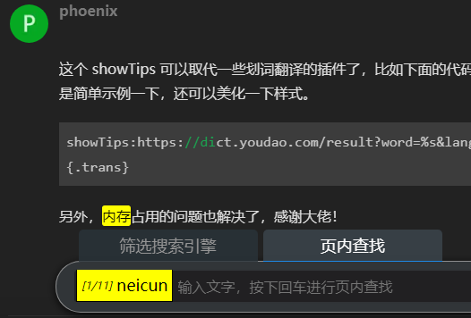 这个 showTips 可以取代一些划词翻译的插件了,比如下面的代码就可以调用有道的查词结果。只是简单示例一下,还可以美化一下样式。