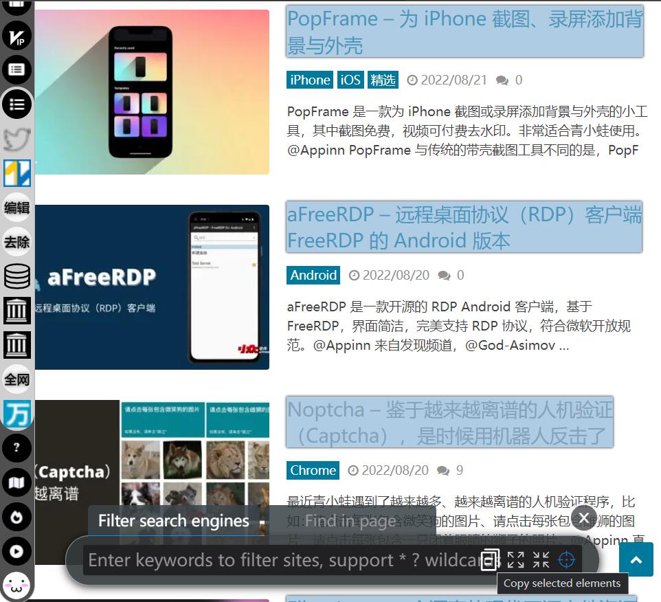 • 抓取元素很好用,方便复制那些不好选取的内容,可以加一个快捷键吗?这样就不用调出搜索框来使用了,一键选取一键复制,或者选取之后用系统自带复制。