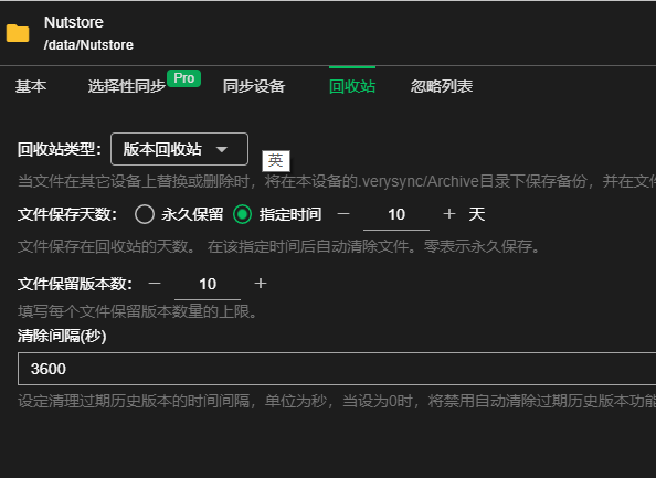在 B 电脑上同步 A 电脑的文件夹 Nustore,就要在 B 电脑上设置回收站。