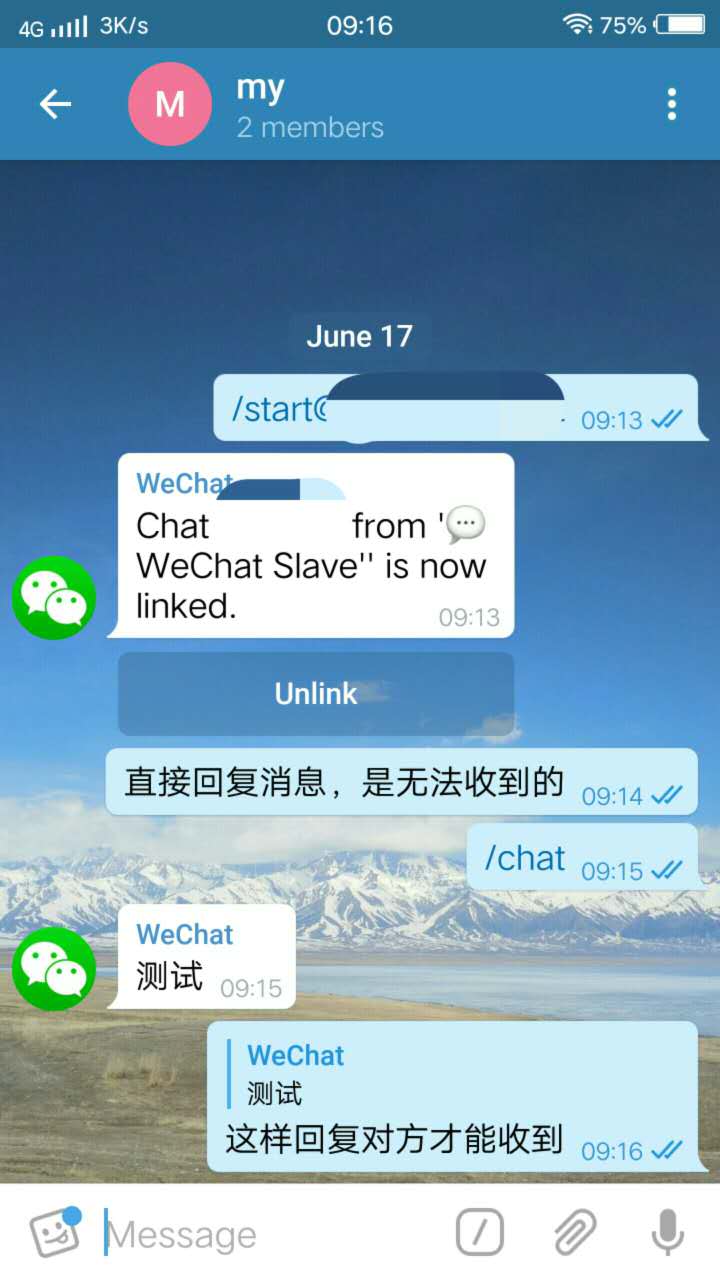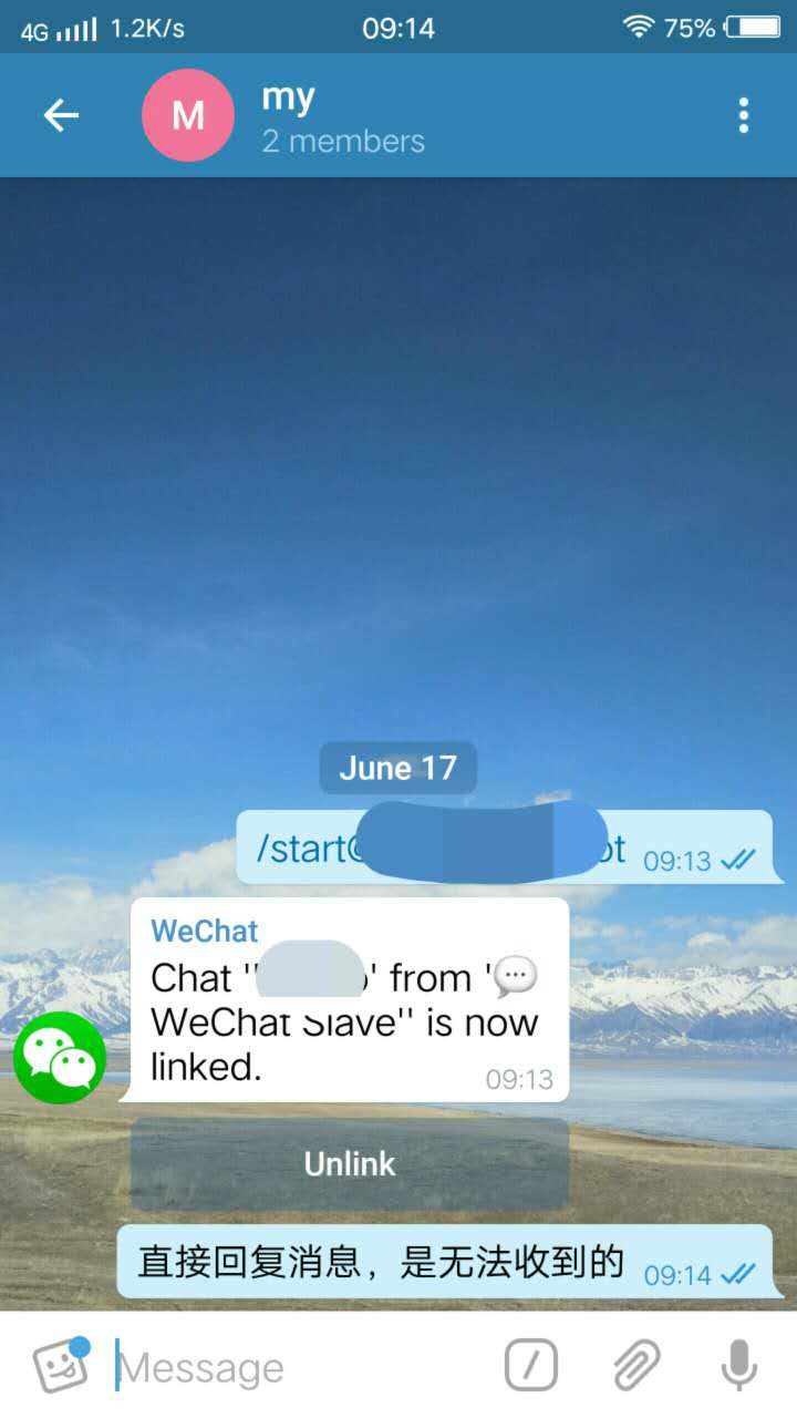 - Group 中除了添加 bot,还能添加 Telegram 联系人,此时该 Telegrma 联系人可以扮演老大哥的节奏,可以观察微信聊天,但微信端无法收到该联系人在 Group 中的聊天(大概意思)