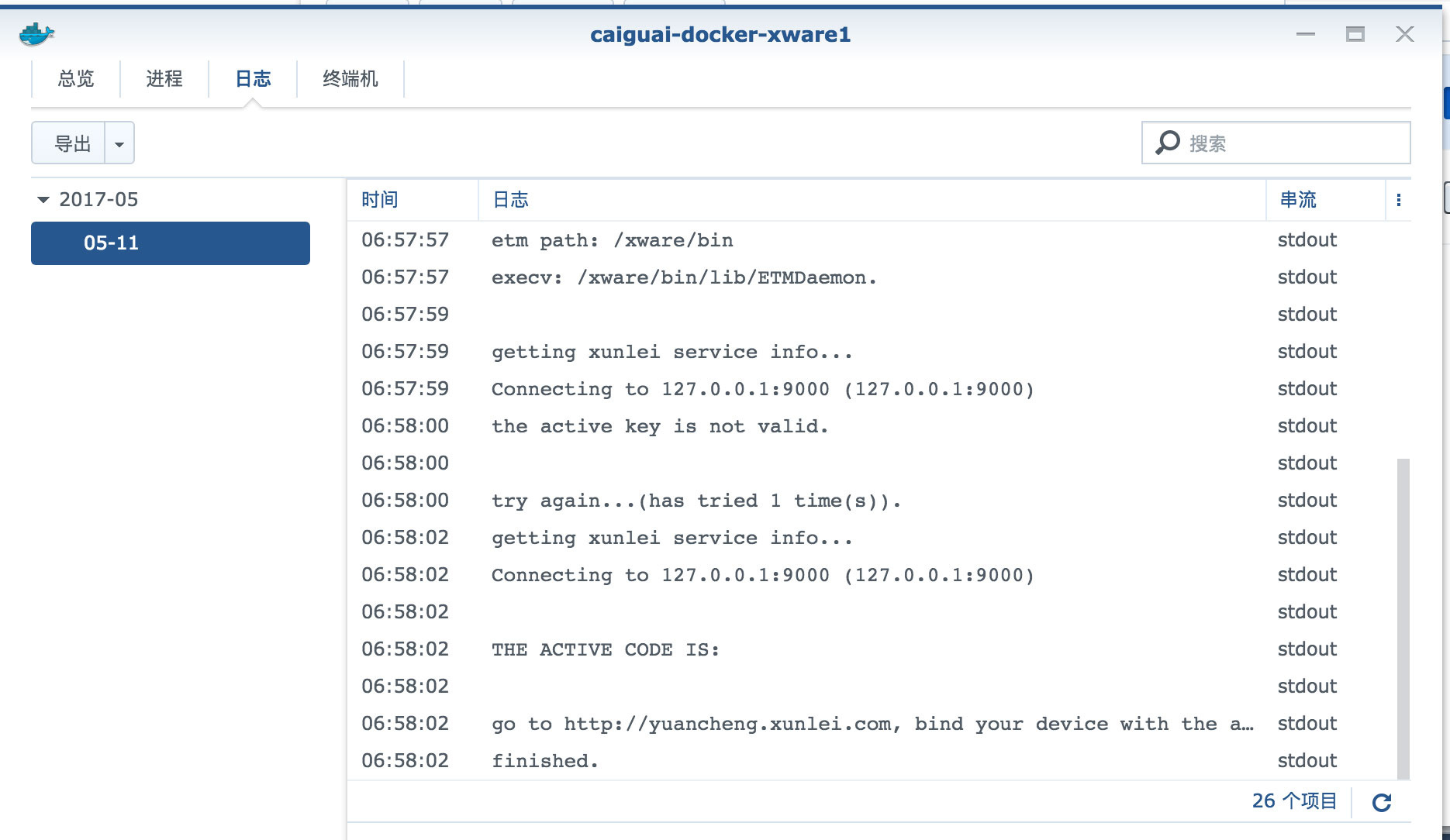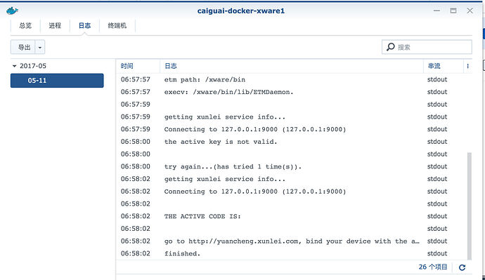 然后在 容器,详情,日志 中找到 code,输入到 http://yuancheng.xunlei.com 即可