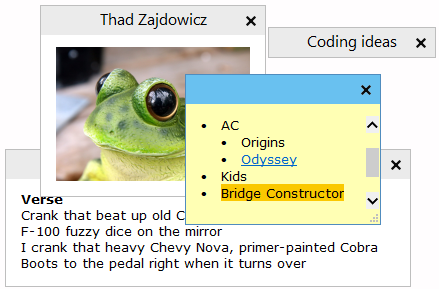 这个和其它的桌面便笺软件相比,比较特别的优点在于可以根据窗口切换不同的便笺,例如打开窗口后,自动弹出某个便笺之类的。其实做起来应该不难,就是多了个窗口触发。。。