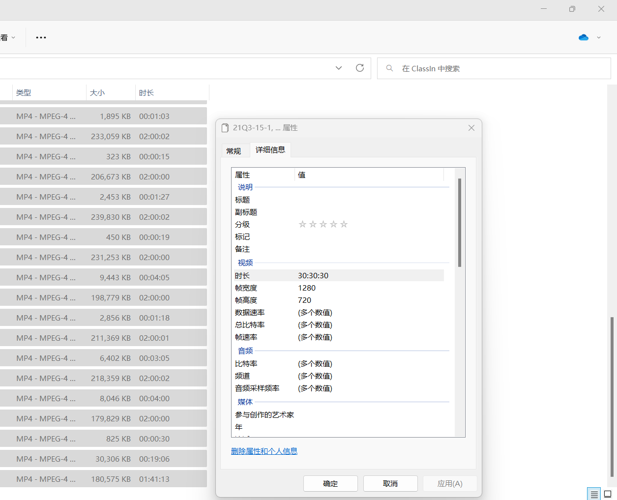 一些视频可能资源管理器不能读取属性(格式不兼容)那就得用其他方法了