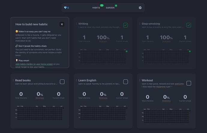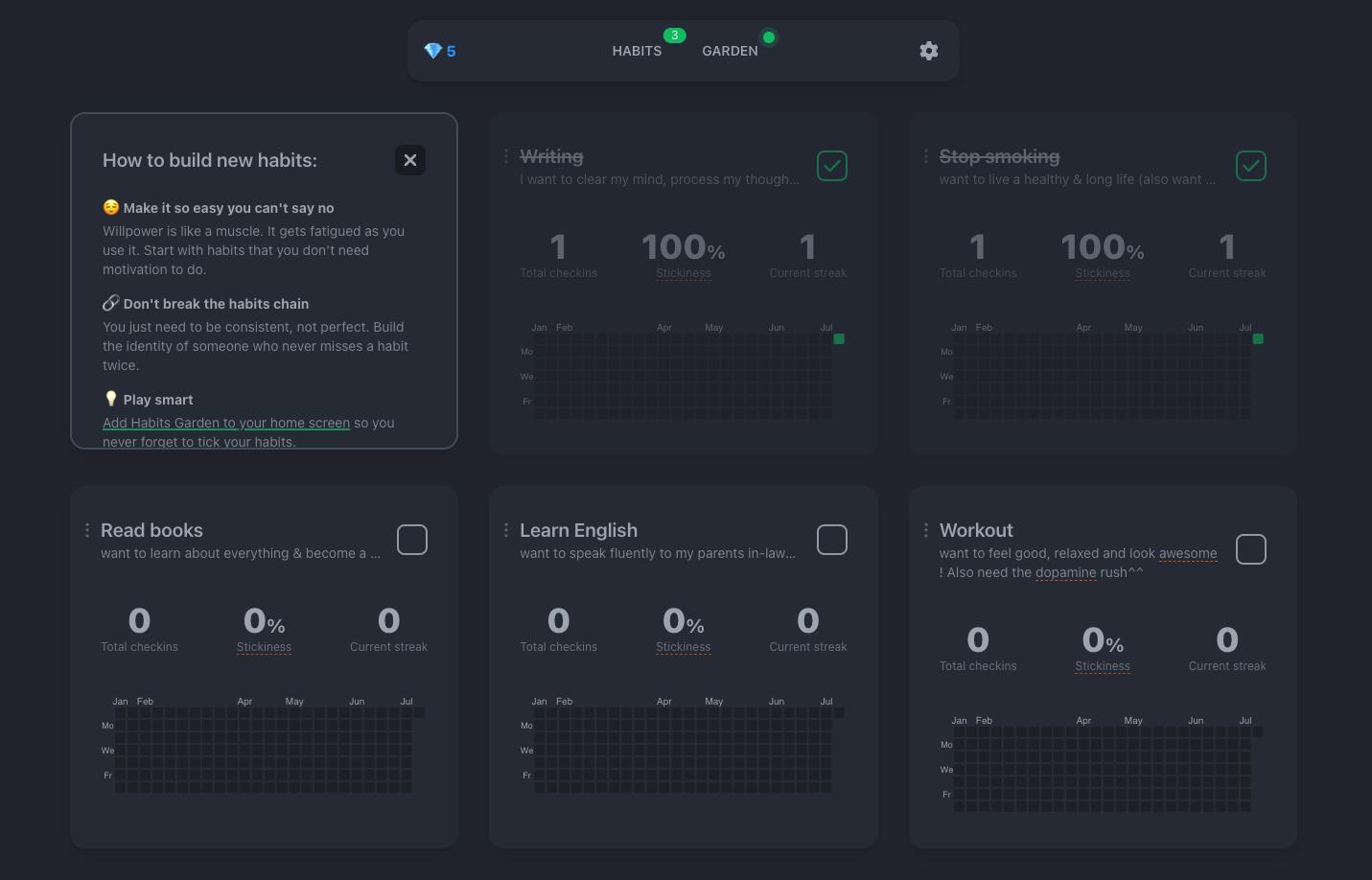 - Habits Garden - 习惯花园,这个产品用游戏的形式来让你养成一个习惯,比如读书,戒烟,学英语等等,每天打卡获得钻石,钻石可以用来种树,也可以邀请好友一起来。界面设计非常简洁好看,还有音效和动画。这个项目是 @marc_louvion 的作品。作者目前在巴厘岛,天天都在冲浪,这个产品每月给他带来$261的收入。