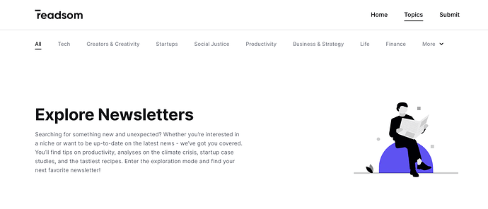 - Readsom - 这个网站收集了很多高质量有趣的 Newsletter ,可以在这里找到一些你感兴趣的内容。这个项目的作者是 @gjusaityte 很不错。