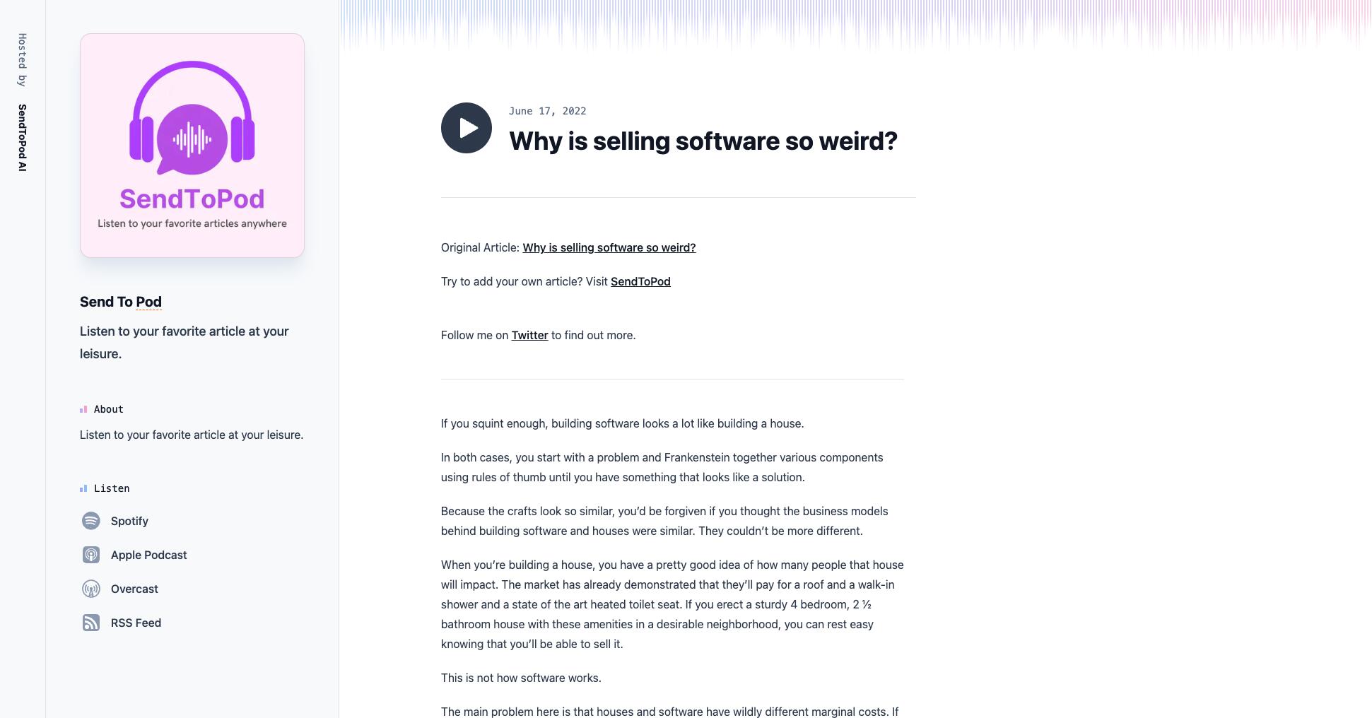 - sendtopod - 这个产品很有创意,可以让你在播客软件上收听你最喜欢的文章。简单说这个产品你可以让你创建一个自己的播客,在上面放自己喜欢的文章来听。“稍后阅读”已经是很多人的习惯了,Matter可能是最的最好的稍后阅读软件了,也支持文本转语音的功能,但不能像这个软件一样可以订阅成播客的形式。很有想法的一个项目,也有更多增值服务。