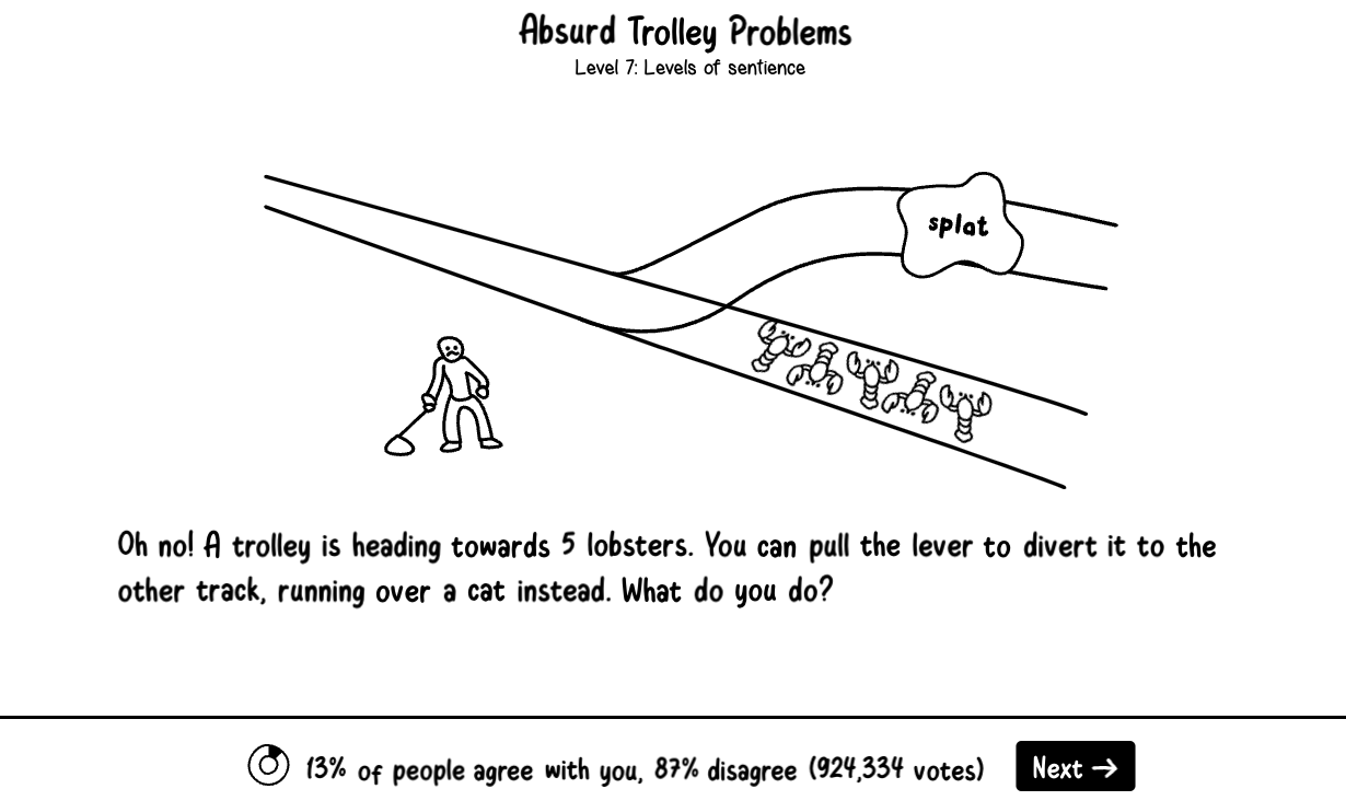 - Absurd Trolley Problems - 这是一个测试小游戏,一个考验人性的测试,很简单的二选一的问题,比如我截图这个选择,如果一辆火车正朝5只龙虾驶去。你可以拉动操纵杆将火车转向另一条赛道,而不是从一只猫身上碾过。你怎么做?有13%的人选择从猫身上碾过,有87%的人选择从龙虾身上碾过。这个下游戏的作者@nealagarwal也开发过非常多有意思的项目,可以在这里看看。