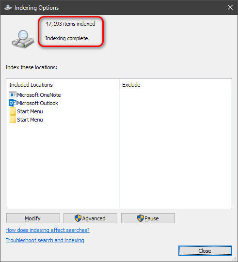 等待"Windows Search" 完成索引建立 (检查进度:Windows 10开始菜单 - 键入"Indexing Options")。